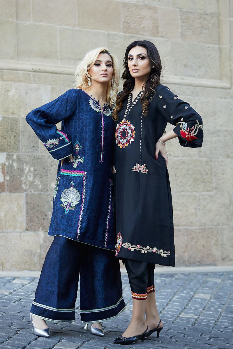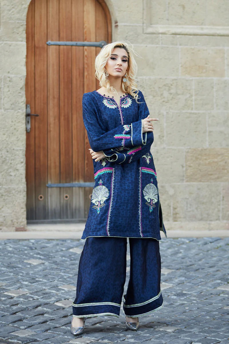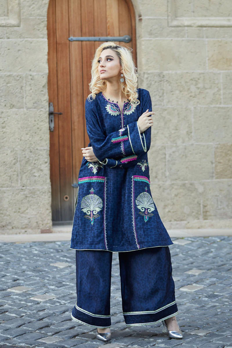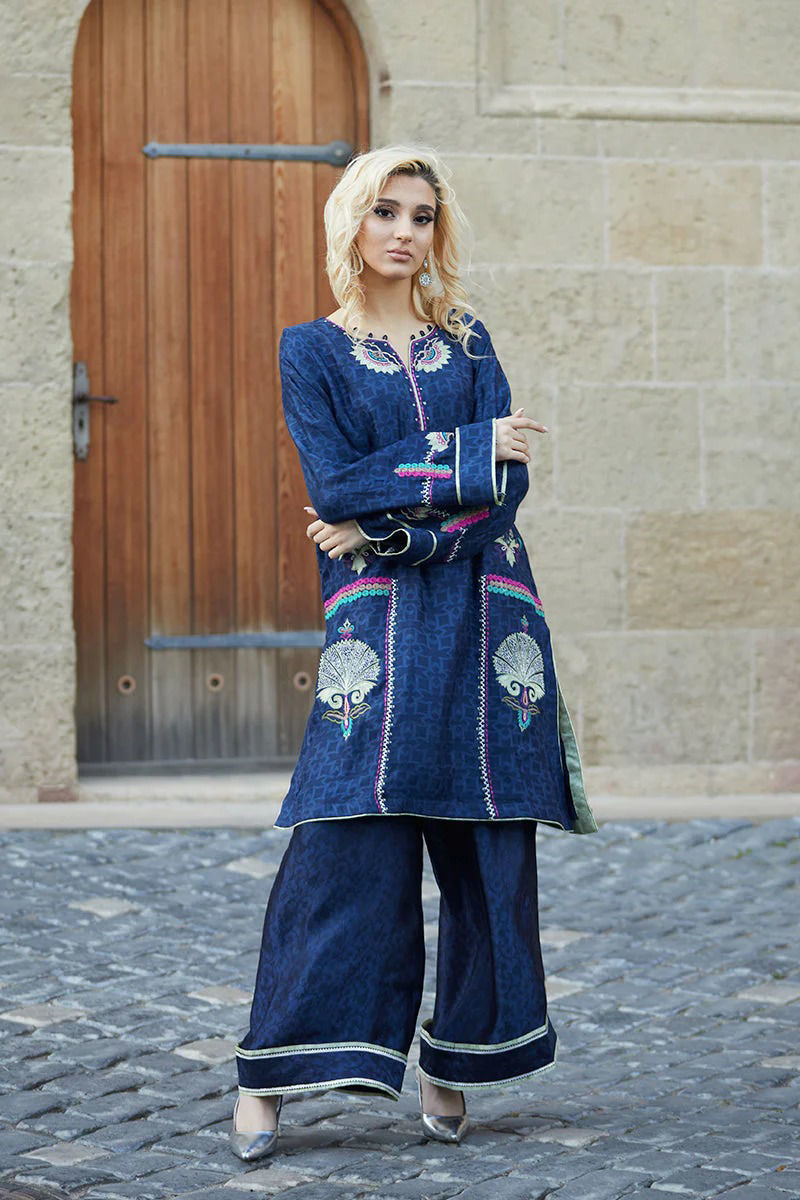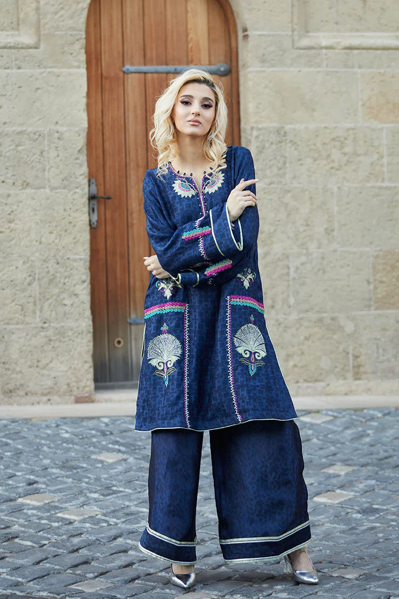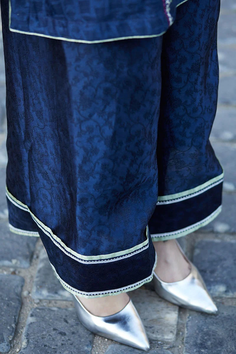 Midnight blue Cotten net shirt is an amalgamation of Apple green appliqués in our statement lotus and multi coloured and contrasting embroideries. Silk embossed izaar with Apple green finishing and kingri ties the look together.