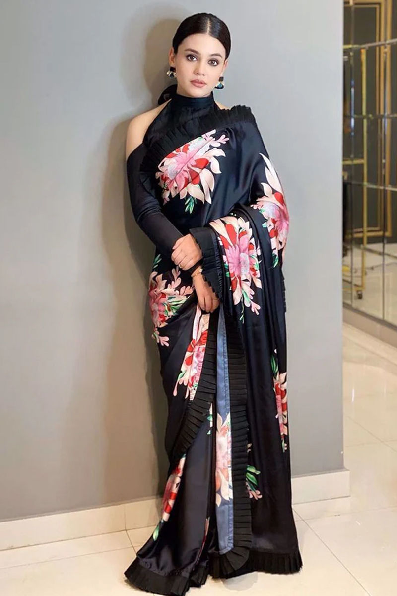 Watercolor digital print on black silk, florals never looked this regal.Saree: Silk
