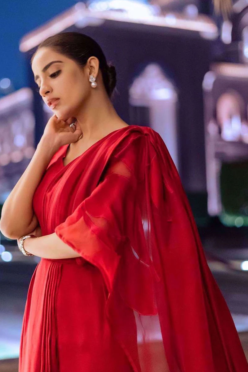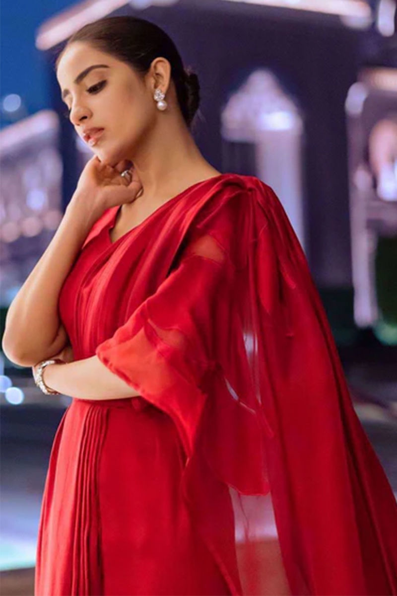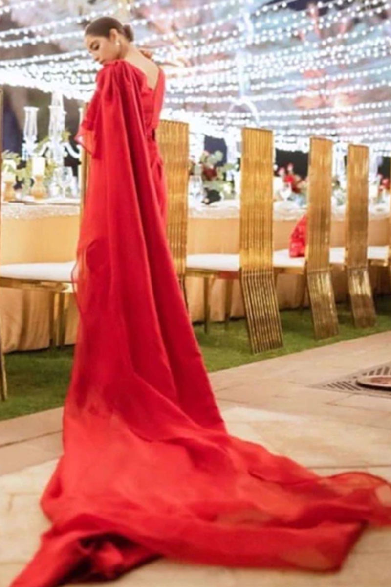 Look drop-dead gorgeous in a red Amna Arshad creation. Shirt: Silk