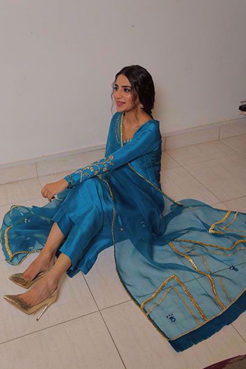 Turquoise raw silk shirt with zardozi handwork sleeves and neckline. It is paired with our signature pants and an organza dupatta which is beautifully finished in gota mirror and frills.Shirt: Pure Raw SilkDupatta: OrganzaPant: Pure Raw Silk