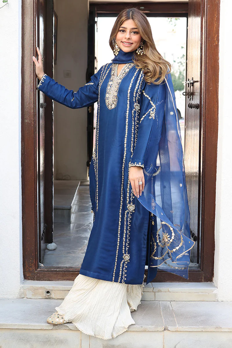 Deep blue pure raw silk shirt is the epitome of grace and elegance this wedding season and eid festivities. shirt is beautifully adorned with kora dabka, gota, zardozi work and our signature inhouse tassles gives the outfit that luxe. otganza dupatta is stunning with impacful gota work and finished off with kingri. pair it up with plain silk pants or the ever stunning crushed silk dhaka pants to turn heads this season! Shirt: Raw Silk Dupatta: Pure Organza