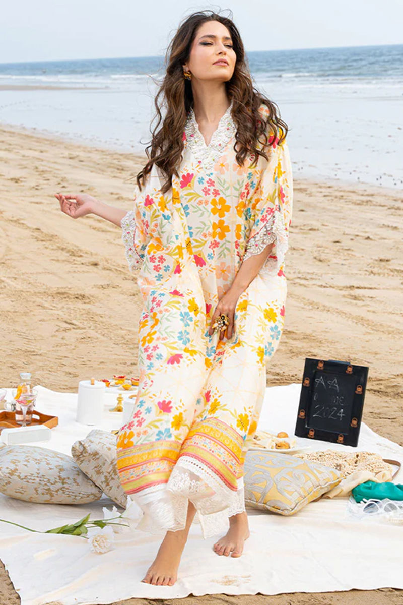 one of our favourites from this collection…easy breezy beachy pure raw silk kaftan in our luxe inhouse print with popping tones is ideal for beach soirees, eid get togethers and much more. embroidery detailings on daaman, sleeves and neckline and dainty handwork detailing its sure to make a wow statement.style it up with a cane bag and keep it all casual or jazz it up with a clutch and accesories.