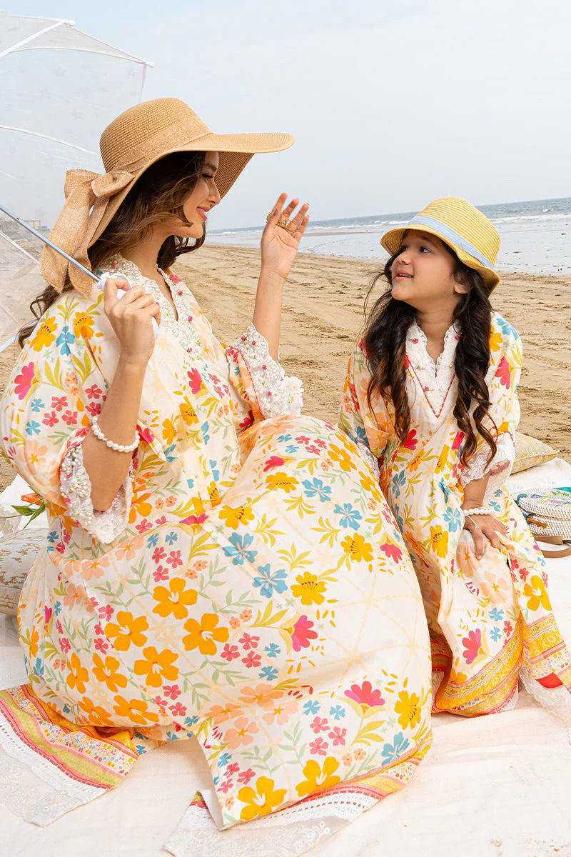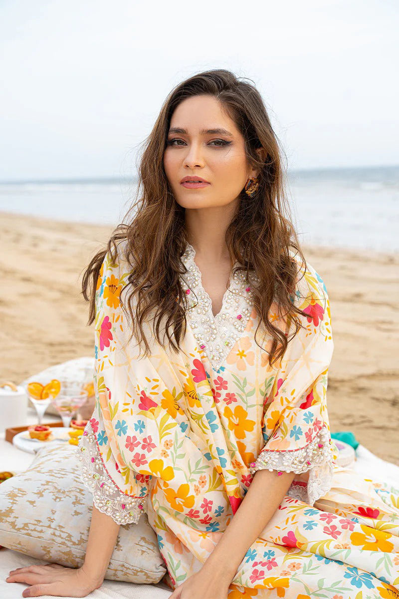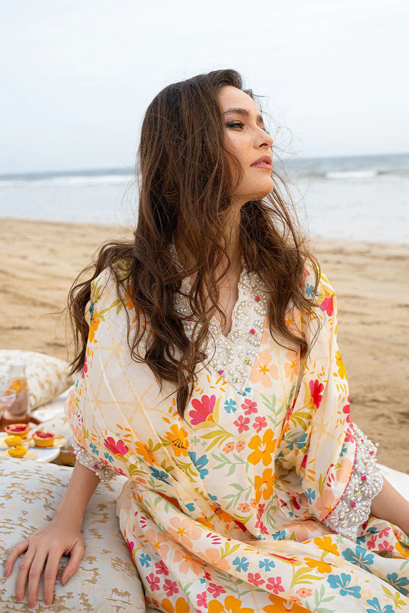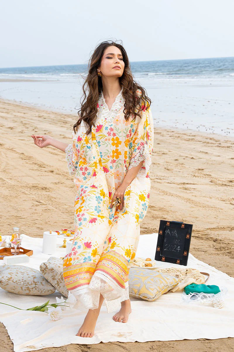 one of our favourites from this collection…easy breezy beachy pure raw silk kaftan in our luxe inhouse print with popping tones is ideal for beach soirees, eid get togethers and much more. embroidery detailings on daaman, sleeves and neckline and dainty handwork detailing its sure to make a wow statement.style it up with a cane bag and keep it all casual or jazz it up with a clutch and accesories. Kaftan: Pure Raw Silk