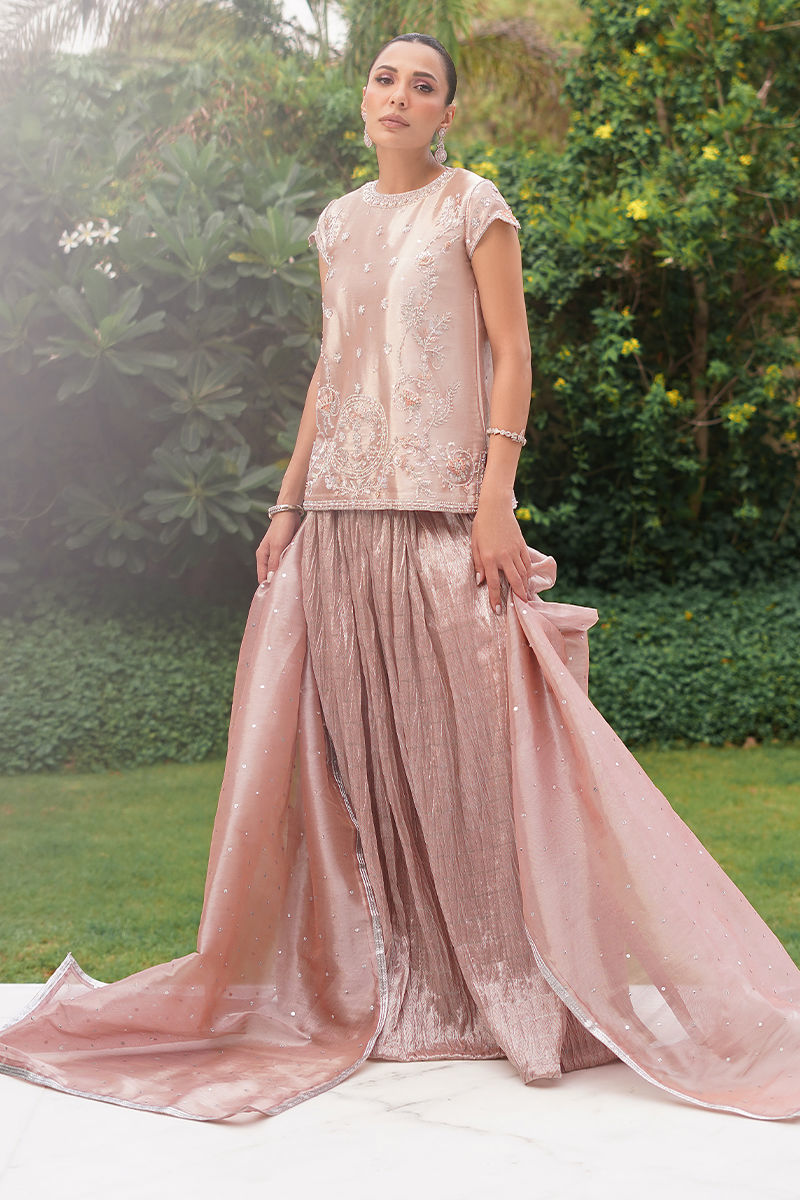 A chic fusion of tradition and modernity, this pink lama silk short shirt is tailored in a contemporary silhouette with modern motifs, intricately hand-embroidered with Swarovski stones, floral resham accents, dabka, and sitara. The look is elevated with a delicate tissue dupatta sprinkled with chan, adding a soft touch of elegance. Paired with a voluminous self-silk crushed lehenga, the ensemble exudes effortless charm, making it a perfect choice for a bride who desires both refinement and a modern edge. Lehenga: Self Crushed Banarsi Fabric Shirt: Lama Silk Dupatta: Tissue