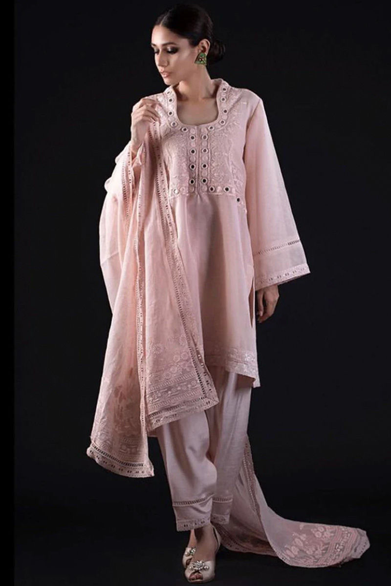 A classic short kurta with shalwar and embossed printed dupatta with lace trimmings. The mirror work gives it a traditional vibe, perfect for all festivities.