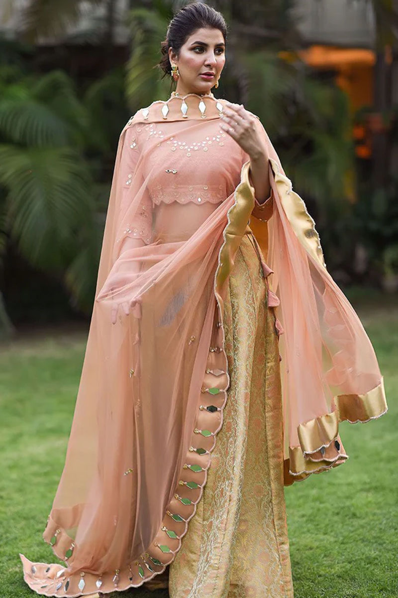 The alisha lengha choli gives the perfect day wedding vibe, the choli is beautifully crafted with sequins and mirror work with jamawar lengha and a net dupatta with mirror finishing.