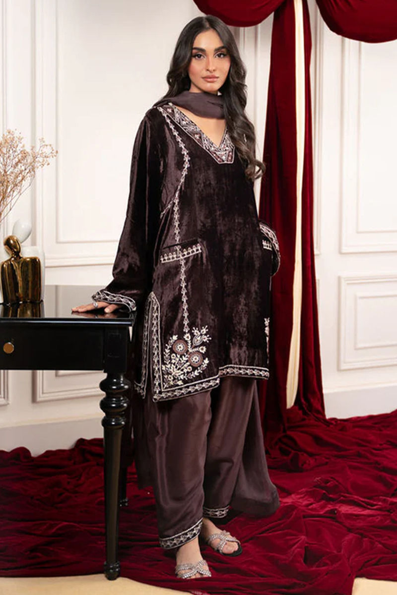 A choco brown velvet shirt adorned with delicate aari embroidery and functional side pockets, paired with a pure raw silk shalwar featuring intricate aari work on the hem. The look is completed with a silk dupatta finished with organza detailing, creating a refined ensemble that exudes understated luxury.Shirt Length: 34''Model Height: 5'5