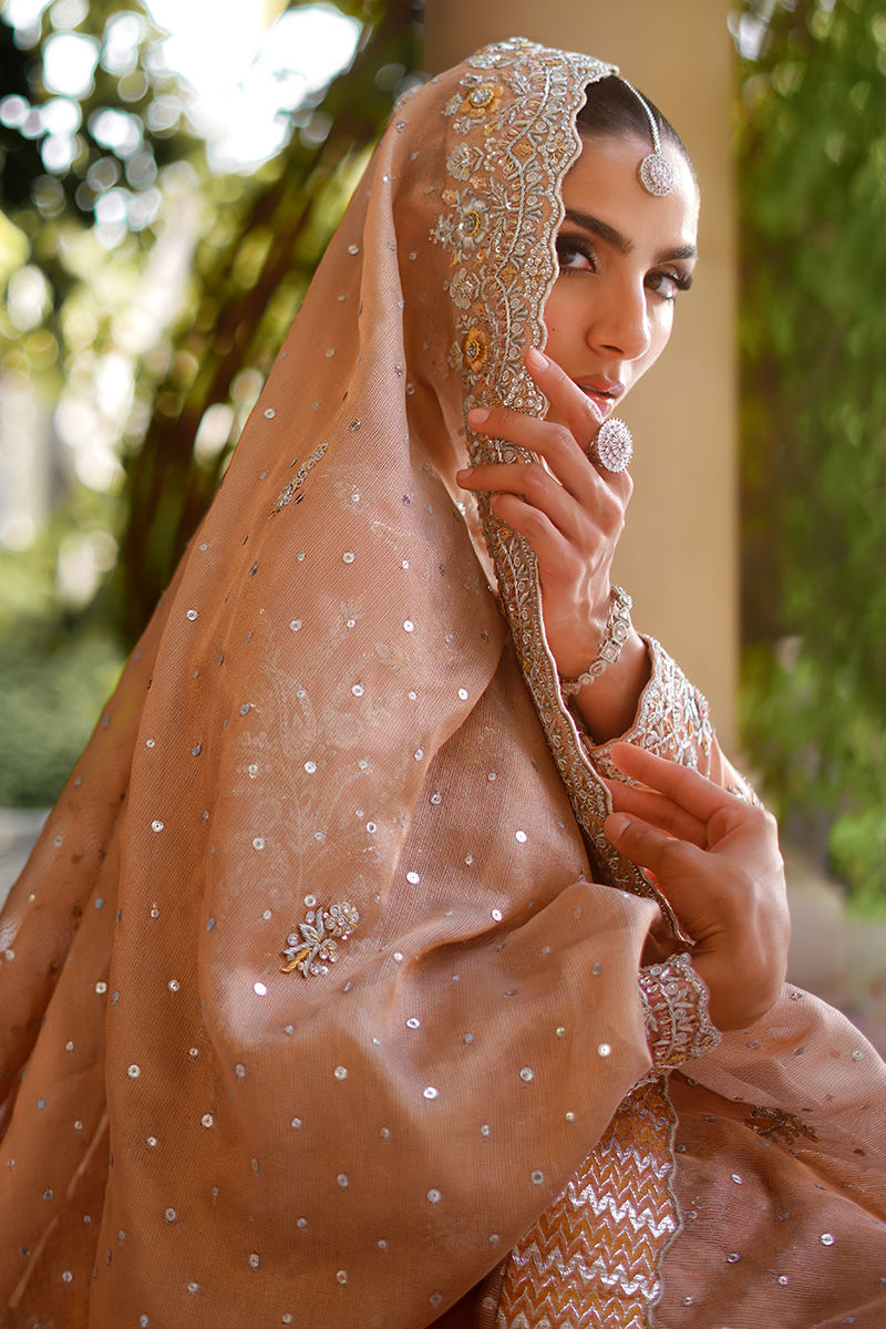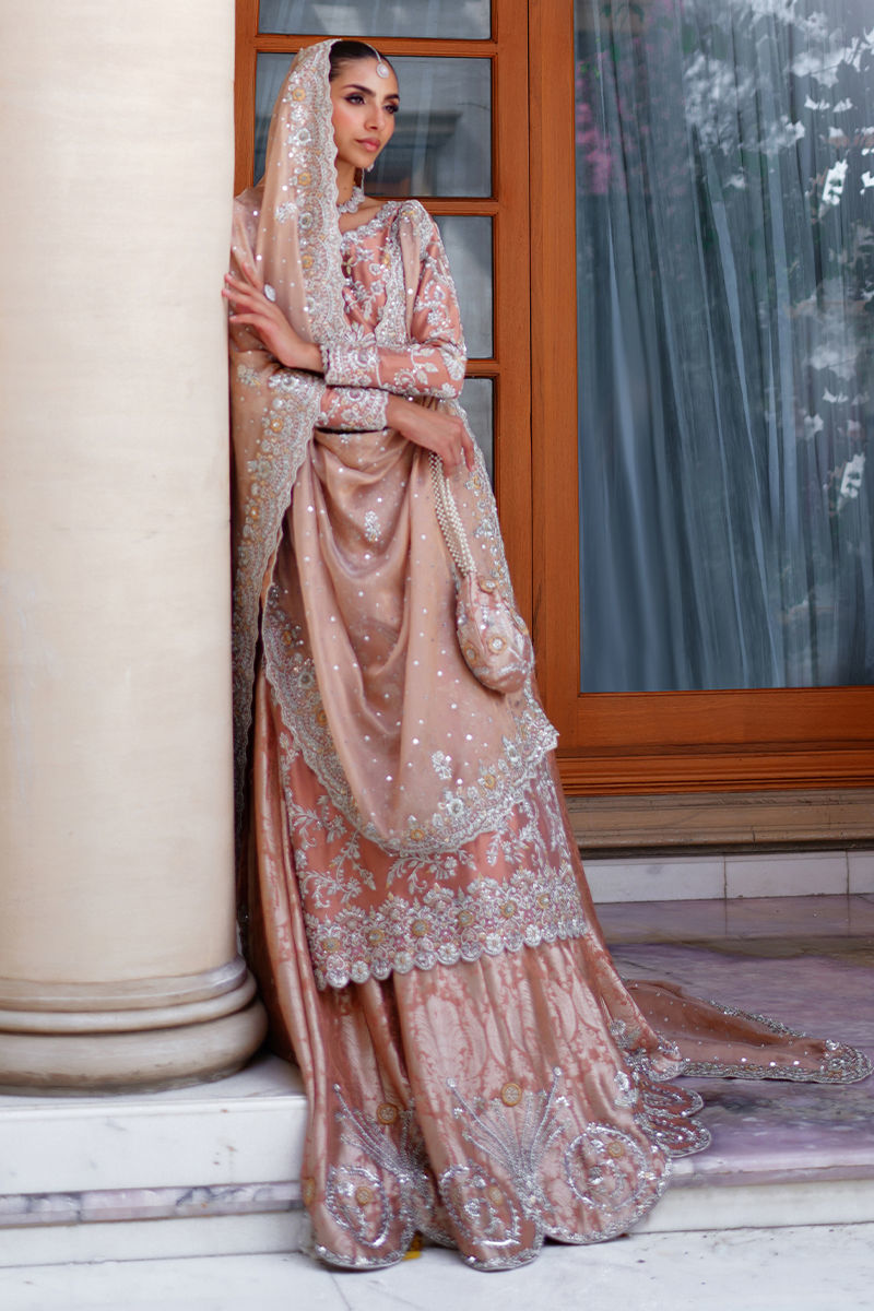 Radiating regal grace, this coral-pink bridal ensemble is crafted from the finest fabrics a pure tissue shirt, paired with a voluminous pure jamawar lehenga, and a flowing pure zari net dupatta. The outfit is adorned with exquisite silver handwork of dabka, Swarovski stones, and sitara, kissed with delicate touches of gold tilla for a subtle warmth. A matching hand-embellished pouch accompanies the outfit as a graceful add-on, completing the look with refined charm. This bridal masterpiece embodies timeless grandeur with contemporary finesse.