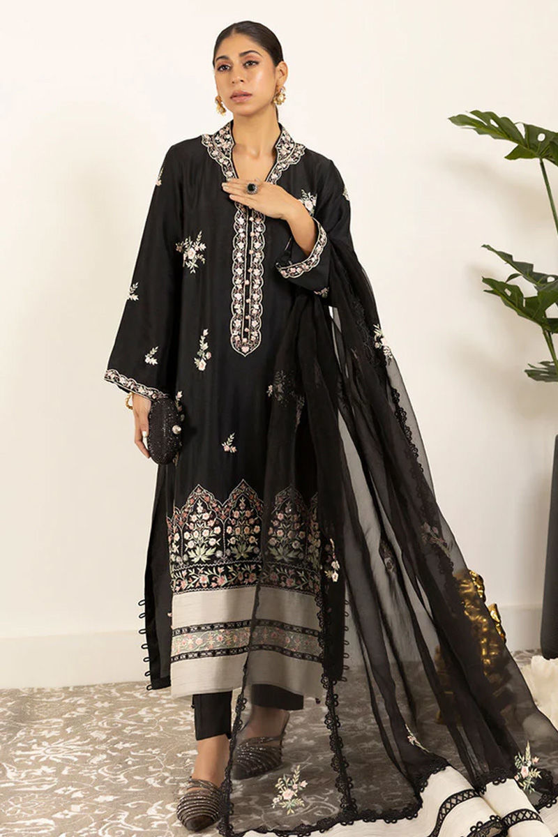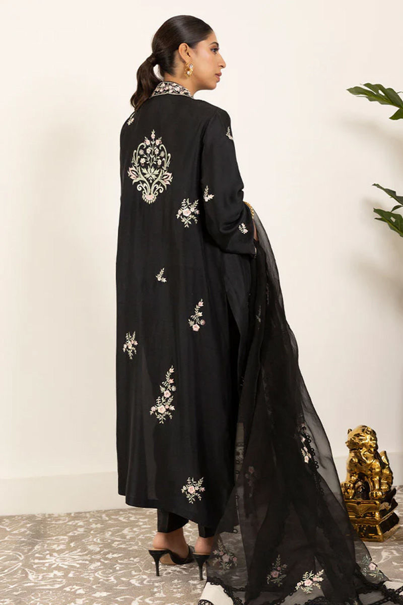 A classic festive black! A must-have for your luxurious wardrobe. The designer's best pick in a relaxed flattering silhouette in pure Raw Silk with intricate signature fully embroidered shirt detailed with pleates making it the show runner! We love playing with embroideries in soothing pastels. The back has beautiful embroidery elements. The pure organza duppata is fully embroidered and detailed with pleates and laces. A modest look that can be gracefully worn from lunches to dholki and valimah events. It is embellished with swarovski crystal.Shirt: Raw SilkPant: Raw Silk