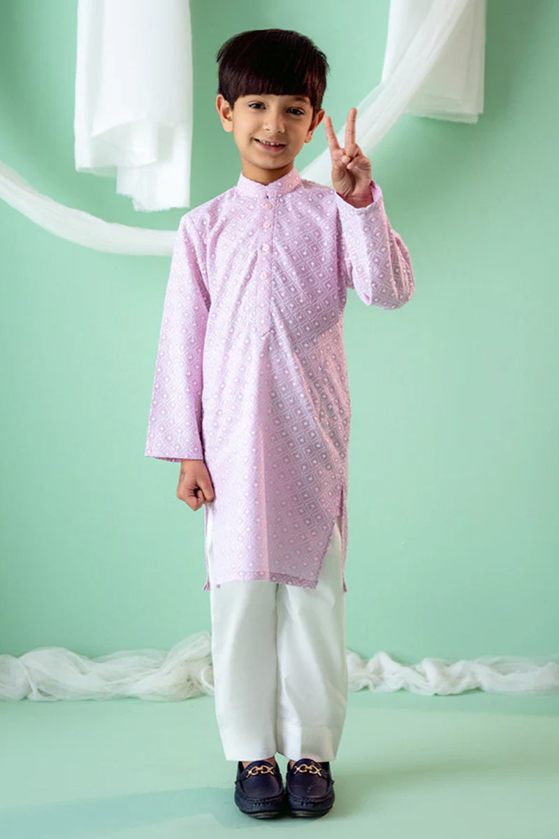 A refined boy's kurta made from soft Schiffli fabric in a calming lavender shade, combining traditional craftsmanship with contemporary style. The delicate Schiffli embroidery adds a touch of texture and elegance to the kurta, with its signature open-thread design that creates a light, airy effect. The kurta features a relaxed yet tailored fit, offering comfort without compromising on style. The subtle lavender color gives the outfit a fresh, understated look, perfect for casual or semi-formal events. Paired with crisp white cotton pants, this ensemble creates a balanced and harmonious contrast, offering a clean, polished appearance. Shirt length: 25" , Model height : 3'8