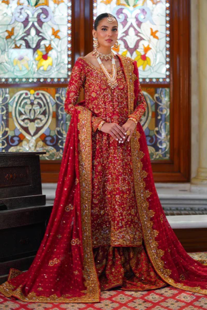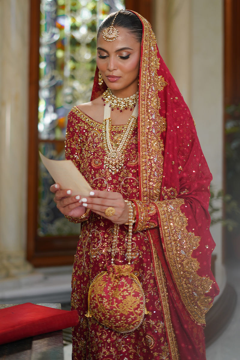An ode to classic bridal grandeur, this red ensemble is meticulously handcrafted to perfection. The pure cotton net shirt and dupatta are richly adorned with gold dabka embroidery, forming an intricate floral jaal layout enhanced with sitara, moti, stones, and resham detailing. Paired with a voluminous pure jamawar lehenga in contrasting tones of red and maroon, the look exudes depth and royal opulence. A hand-worked pouch completes the set, adding a graceful finishing touch. This bridal masterpiece blends timeless tradition with refined artistry, making it a true heirloom piece.