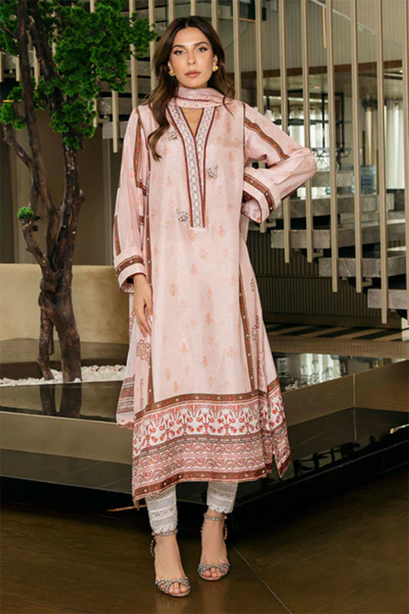 The tea-pink silk shirt features elegant hazelnut panels adorned with intricate floral patterns, creating a harmonious contrast. Delicate pearl embellishments and glistening Swarovski crystals add a touch of opulence and sparkle to the design. The shirt's beauty is enhanced by in-house embroidery borders that showcase artisanal craftsmanship. Handcrafted buttons add a refined touch to the ensemble. The luxurious printed dupatta complements the shirt, finished with exquisite lace detailing that exudes a sense of timeless charm and sophistication.Shirt: Raw SilkDupatta: Raw Silk
