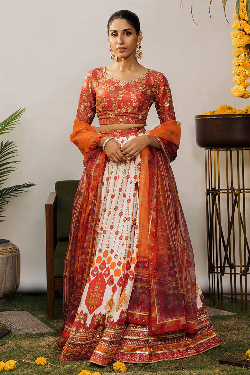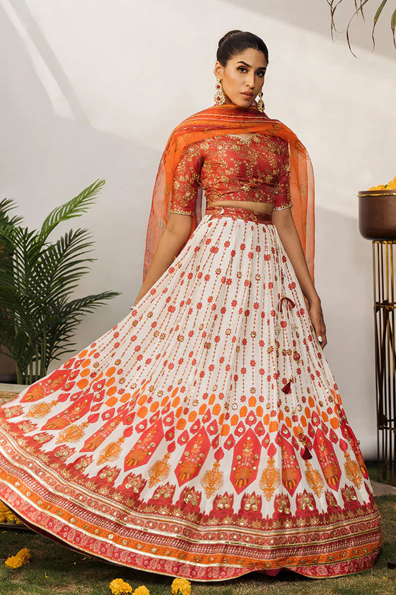 We can’t take our eyes off this lehnga choli on pure raw silk Geometric and floral prints on a flowy lehnga and classic choli. Playful Gota on lehnga is sprayed all over to create an impact and intricate tassles adds that ethnic vibe. Choli is also an all Gota worker with hand embellishments of kora dabka and resham. Printed organza dupattta is as exciting as the lehnga choli which compliments the whole look. This season rep this on mehndis, dholkis and mayuns. Lehenga: Raw SilkRaw Silk Choli: Raw Silk Dupatta: Raw Silk