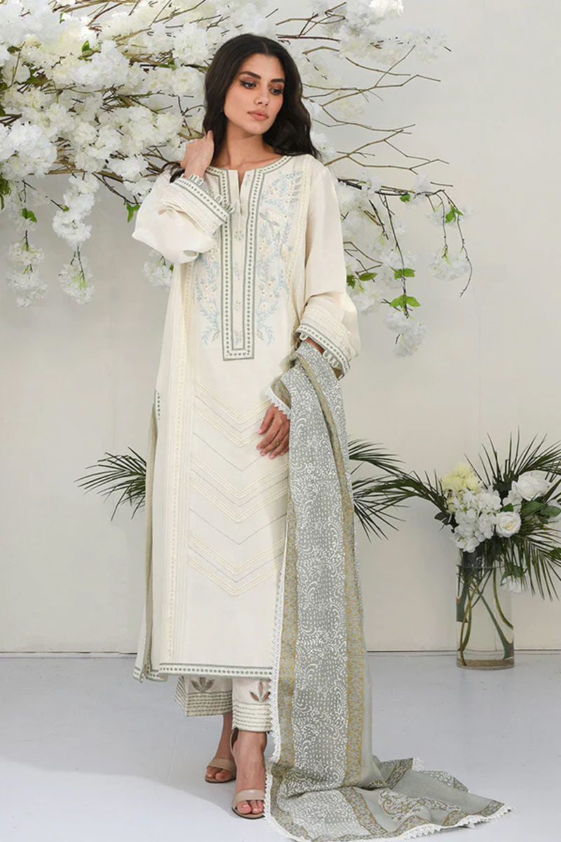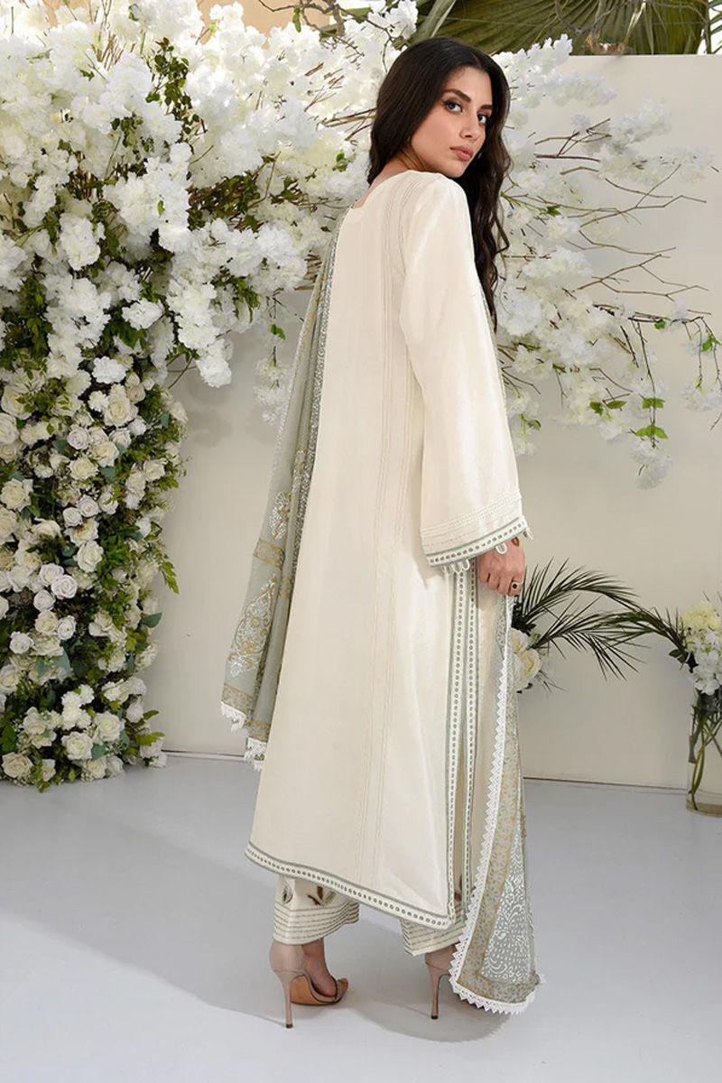 A relaxed fit ivory pure Raw Silk kurta with delicate embroideries in hues of aqua blues, mint greens and ivory embellished with swarovski crystals making it Amna’s favourite this season. We have stylishly added pin tucks and lace detailing to make you noticed. The neckline is easy breezy specially designed for the summer heat. Sleeves are detailed with finesse with laces and loops to strike a balance between glam and minimalism as A Signature Amna Arshad ensemble. The cotton chiffon flowy dupatta is block printed in a beautiful tone of pistachio green finished with lace . The dupatta is so versatile that you can pair it up with any of your other outfits also.Shirt: Raw silkDupatta: Raw silk
