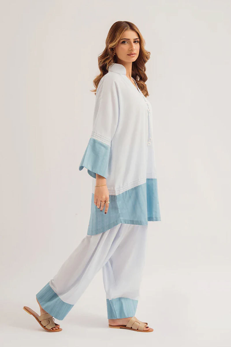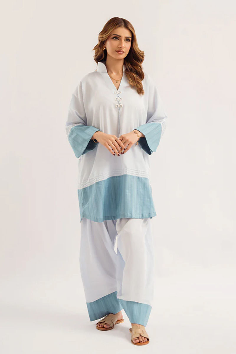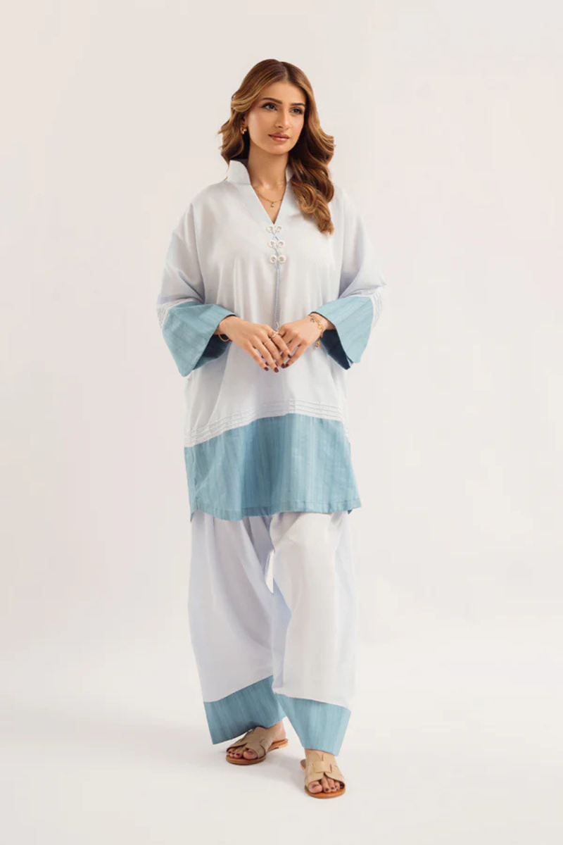 Step into effortless elegance with this exquisite ensemble.The short shirt, in a soothing light blue shade, boasts a clean, minimalist design that accentuates its simplicity and sophistication. Delicate tassels adorn the neckline, adding a subtle hint of charm and movement.The shalwar's fluid drape offers comfort and ease of movement, while its understated elegance complements the structured silhouette of the shirt.