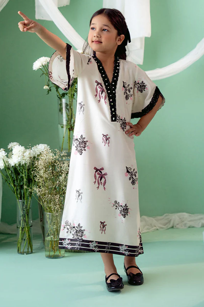 An exquisite Khaddi Silk ivory kurta with a striking black bow and floral print, designed in a graceful kaftan cut. The soft ivory silk fabric serves as a beautiful canvas for the bold floral motifs, which delicately intertwine with the classic black bow design, creating a stunning visual contrast. The overlap neckline adds a modern, flattering silhouette, while the hand-embroidered details around the neckline. Shirt length : 36" , Model height : 3'9