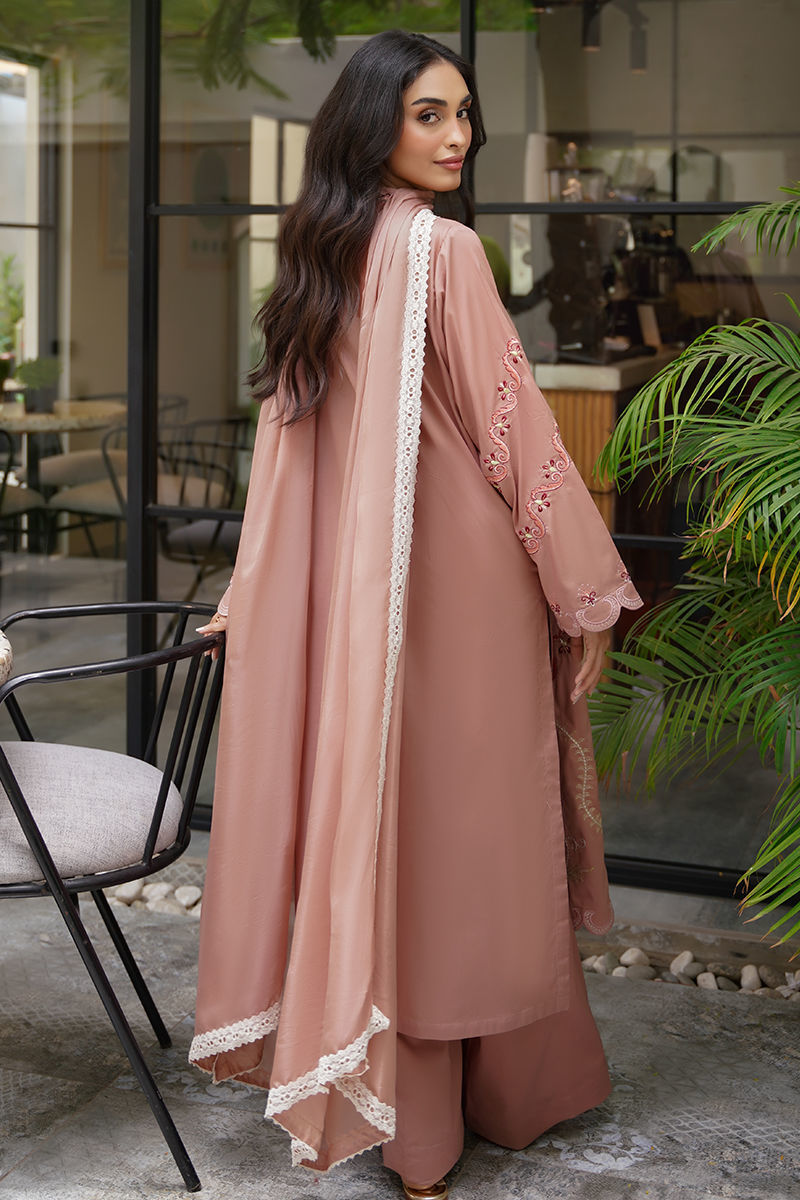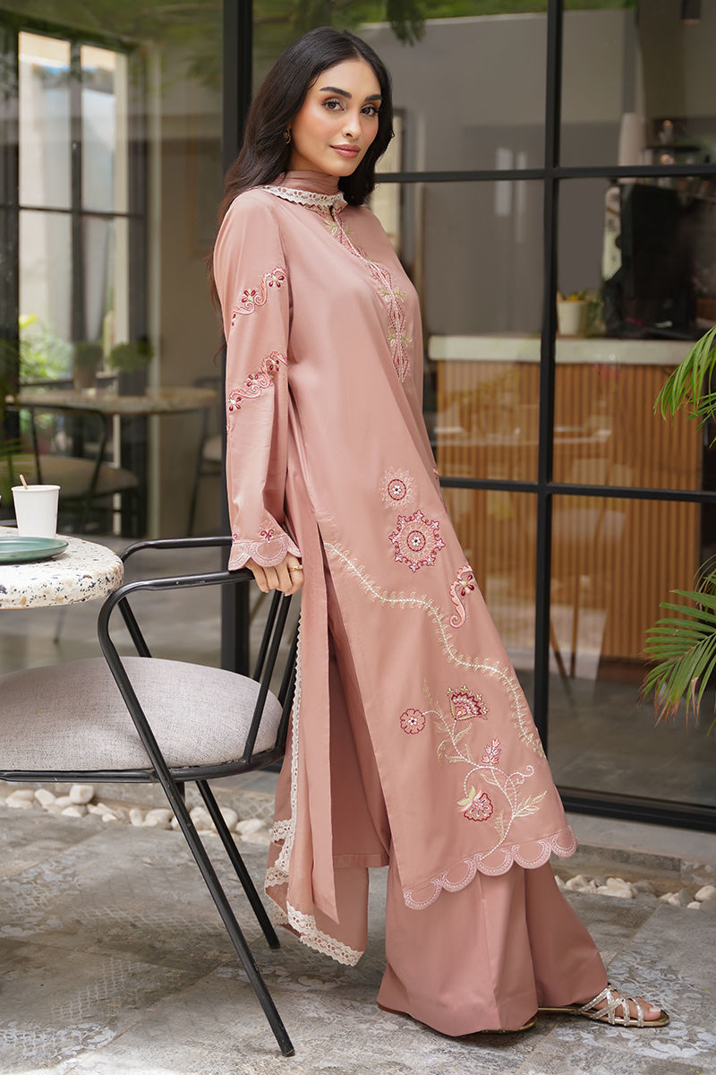 Soft yet striking, this pink long shirt is a celebration of intricate artistry and feminine charm. Adorned with delicate embroidery in tones of ivory, blush pink, and rich reds, the design weaves geometric and floral patterns together for a modern yet timeless look. Paired with coordinated pants for an effortlessly elegant silhouette, the ensemble is elevated further with an optional silk dupatta — luxuriously lightweight and beautifully finished with lace detailing for a graceful, refined touch. Perfect for luncheons or intimate gatherings! maximum shirt length:46 Model height:5'5 Style: Loose Fit Shirt: Cambric Lawn Dupatta: Tissue Silk Trouser: Cambric Lawn