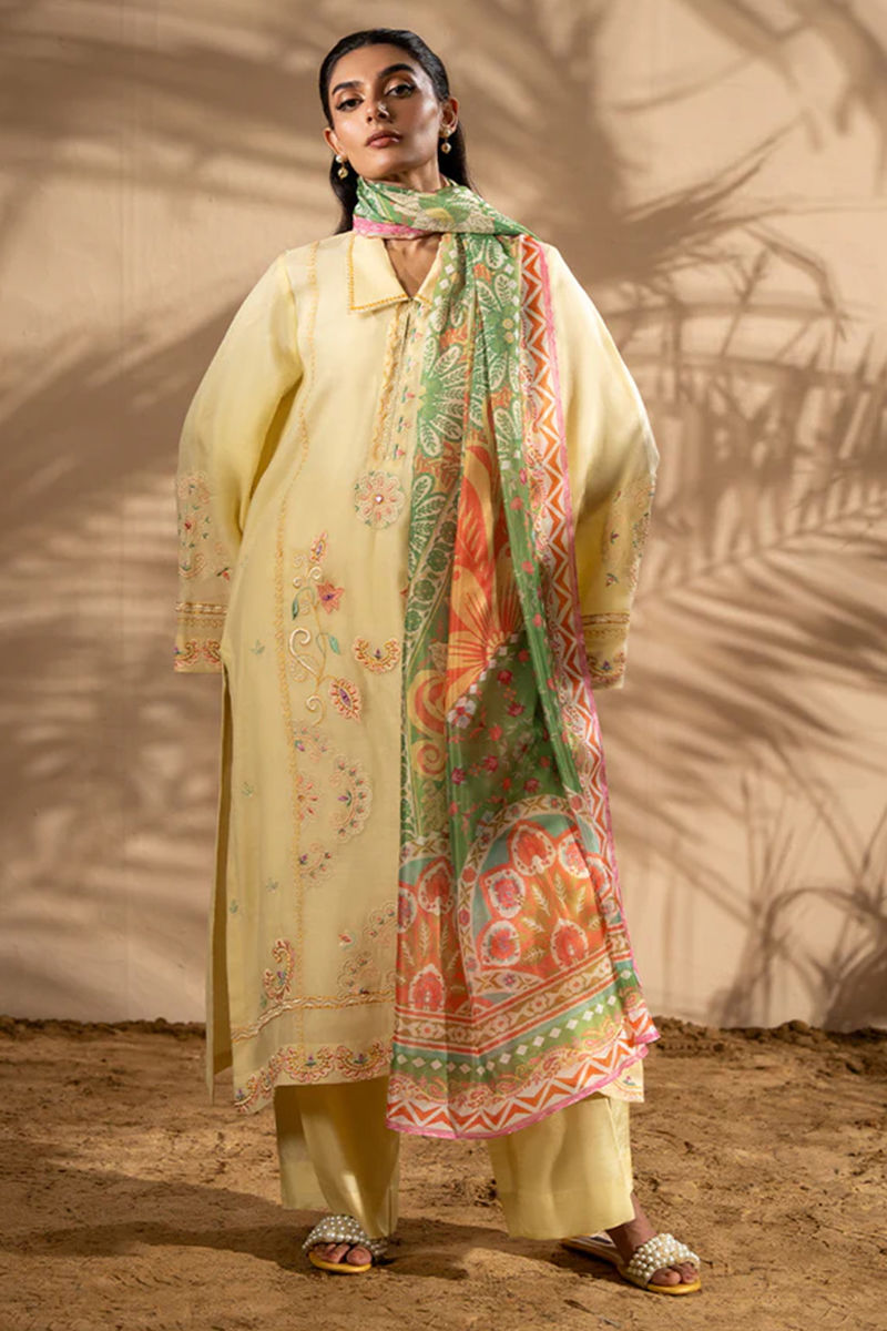 This radiant shirt is adorned with intricate embroidery and delicate sheesha work, creating a soft shimmer that catches the light effortlessly. The trumpet sleeves add a modern, airy touch, enhancing the breezy silhouette. Paired with sleek imported raw silk pants and a contrasting printed silk dupatta, the look strikes the perfect balance between elegance and vibrancy. A must-have for chic summer soirees and festive daytime affairs. Dupatta is an add on.Shirt maximum length 45Model height 5'5