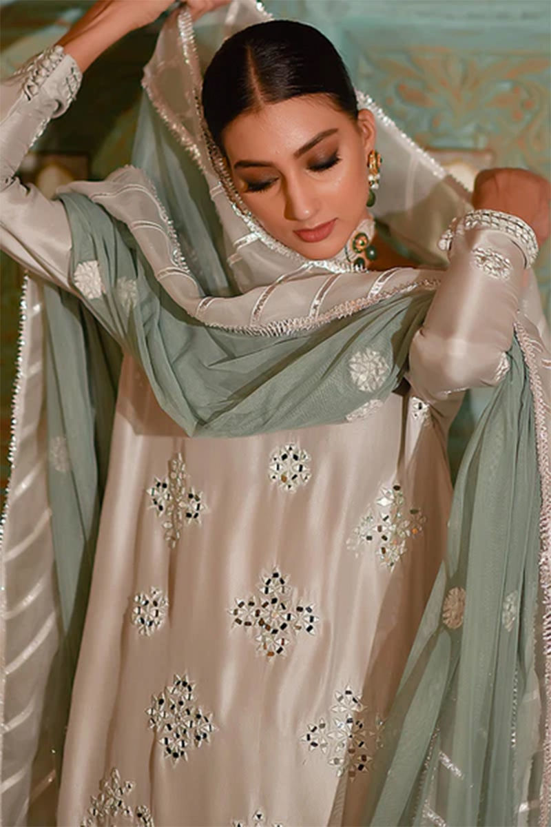 The must-have soothing mint green kurta is fully worked with sheesha and machine embroidery along with neckline to glamorize the look. It is paired with our signature pants and a net dupatta enhanced with sheesha booti's and gota finishing.Shirt: Raw SilkDupatta: Raw SilkPant: Raw Silk