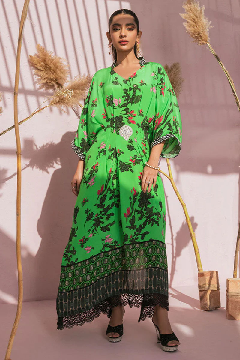 This fusion kaftan is everything spring. An in-house printed kaftan with worked laces and embellishments is all you need this season from sundowners and soirées.Kaftan: Pure Crepe Silk