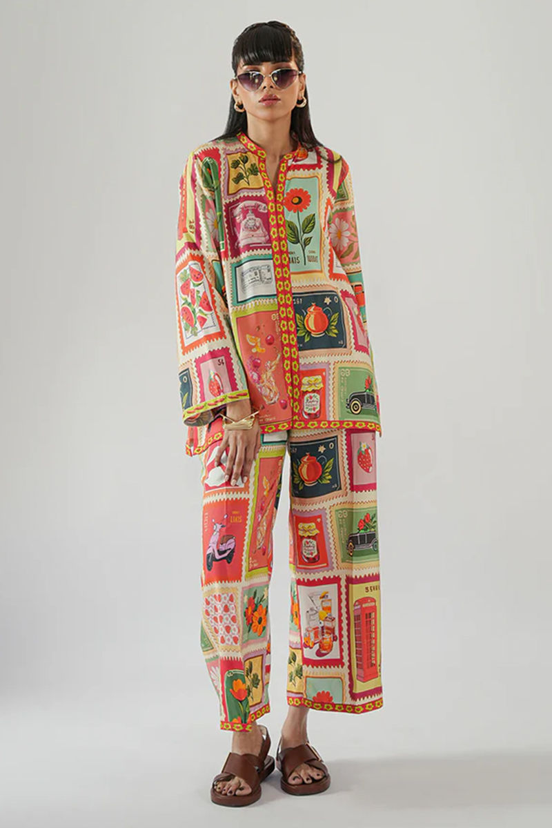 This vibrant Khaddi Silk co-ord set brings a playful, artistic touch to your wardrobe. Featuring a unique postcard-inspired print with funky patterns in shades of orange, peach, pink, and green, the set offers a fresh, eclectic vibe. The rich texture of the Khaddi Silk elevates the colorful design, creating a perfect balance between casual comfort and creative flair. Whether you're dressing for a laid-back day or a fun outing, this co-ord set stands out with its bold patterns and lively hues, making a statement while maintaining a relaxed, chic aesthetic. Model height 5'8, maximum shirt length 27" Shirt: Khaddi Silk Pant: Khaddi Silk