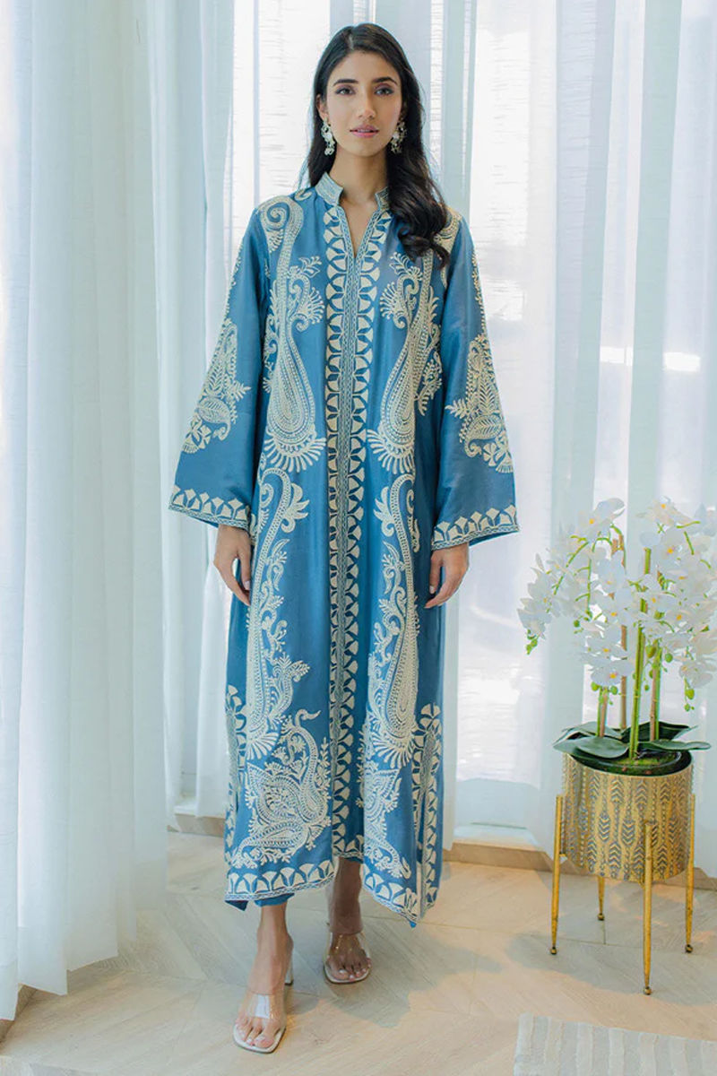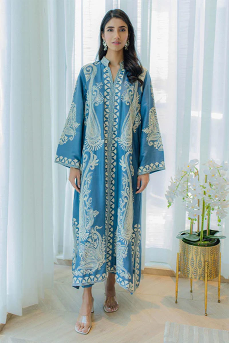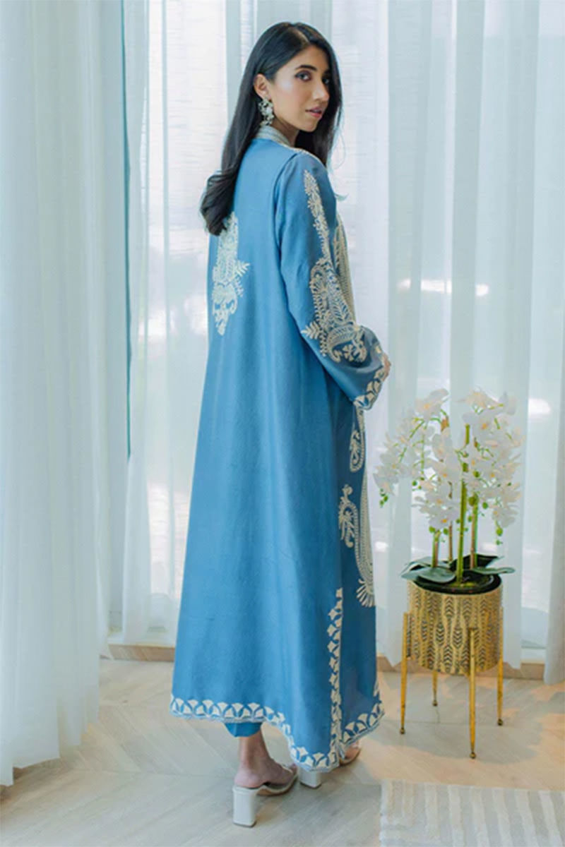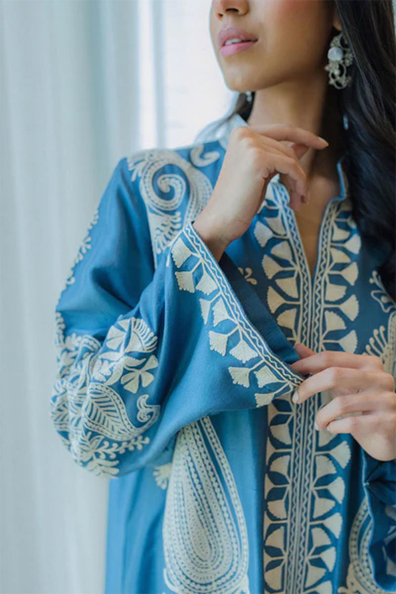 Epitome of grandeur and elegance in this pure raw silk ocean blue silhouette with fully intricate aari work, front open baggy long shirt… need we say more? Pure raw silk pants complete the whole look. Style it up or down with pearl studs and a statement bag. This outfit comes along with the shirt and dupattaShirt: RawsilkPant: Rawsilk