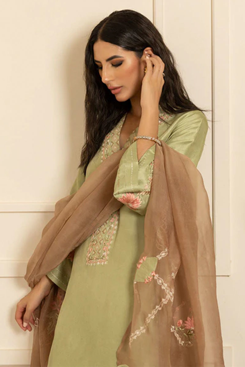 Cut in luxurious pure rawsilk in a soft tone of tea green. Oh so soothing for the summer afternoons and evenings.We have carefully embroidered the neckline and sleeves in artisanal embroideries fusing geometric patterns and florals!Dupatta in luxurious pure flowy organza embroidered in-house with artisanal embroideries and appliqués instantly dressing up the outfit!shalwar pure rawsilk with lace detailingShirt: Raw silkDupatta: Organza