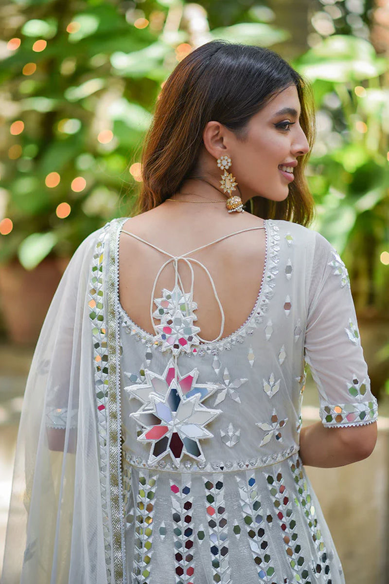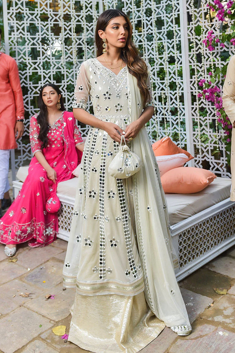 You all know our love for ivory! Sheesha and ivory is all ticks for a perfect festive oufit! A fully worked resham and sheesha front open kalidar, wear it to a nikkah or dazzle on a mehndi dance floor! The double necked bodice makes this kalidar absolutely body flattering! We love the elbow lenght sleeves and the mirror phool statement tassel, the duppata is fully worked with 4 sided borders and booties, making it a perfect outfit for a nikkah bride! We have paired it up with an ivory shimmer lengha to make it more blingy and festive! Get a Customized name potli pouch with your name or dulha’s name. Shirt: Resham Dupatta: Resham