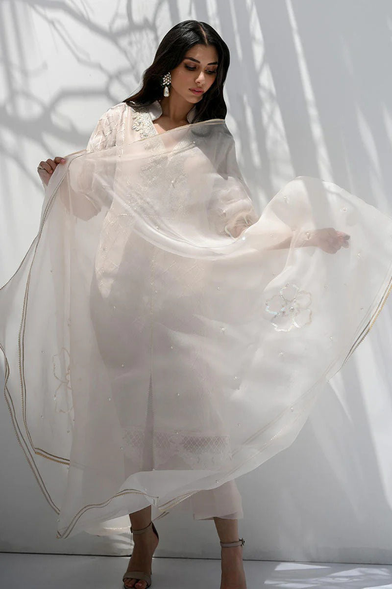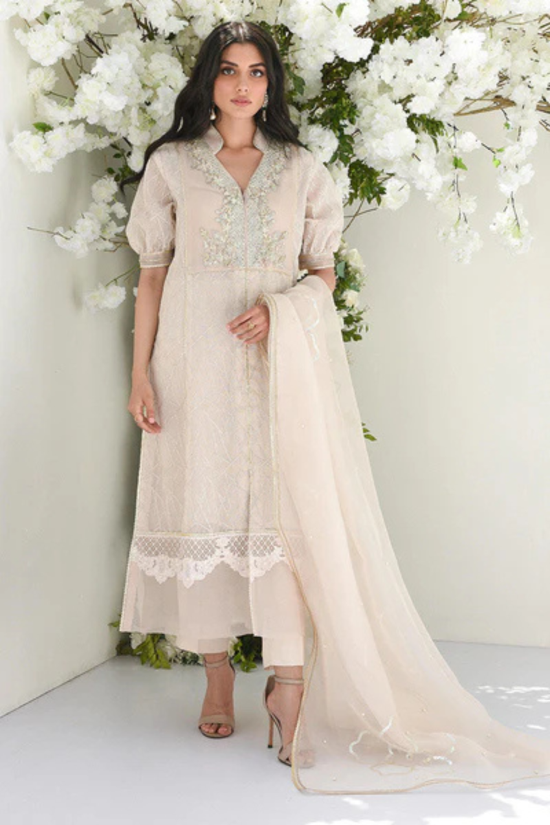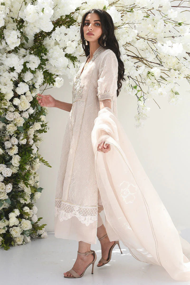 A soft shade of ivory pink with a chic front open silhouette embroidered and handworked neckline with balloon elbow length sleeves. An ideal brunch or nikah wear! The dupatta is handworked with floral motifs and finishings.