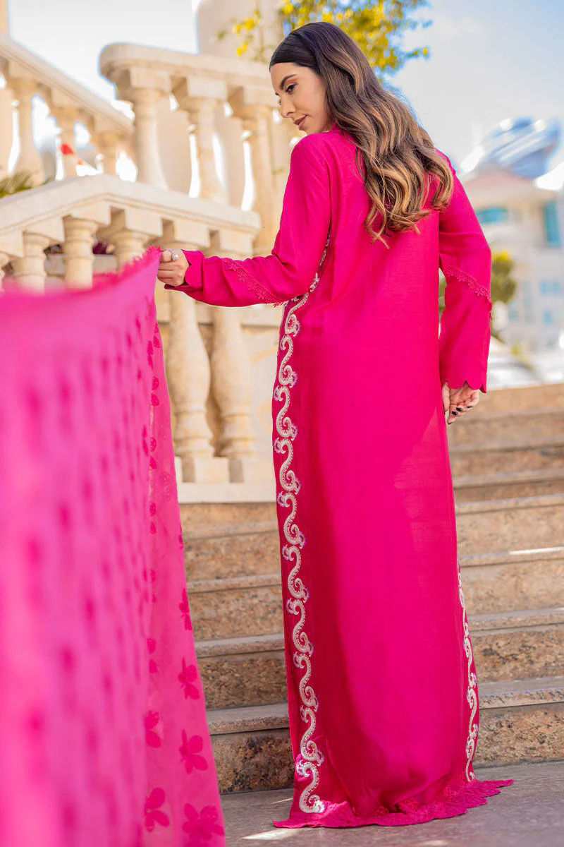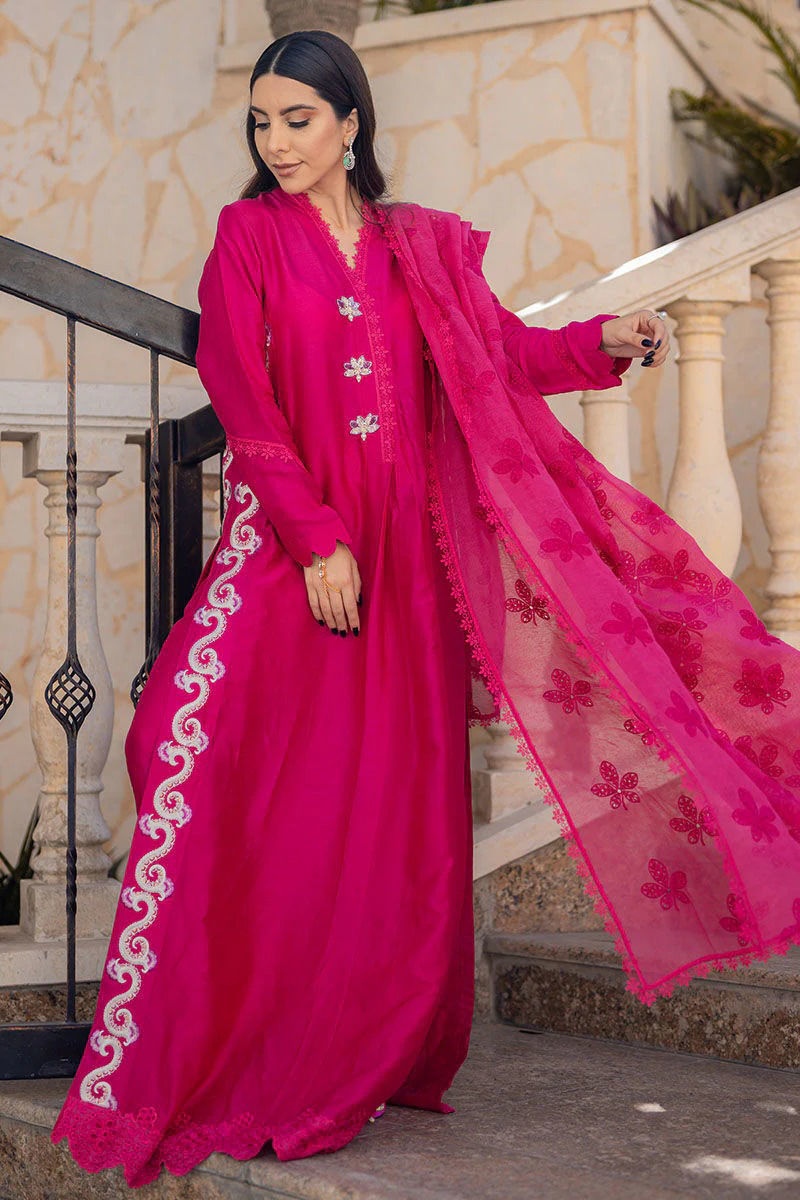 A spring/summer favourite hot pink silk shirt with an Uber chic box pleat cut and pants with beautiful embroidered panels on side slits with playful colours. The outfit is finished with our signature handcrafted buttons, lace detailing on sleeves and neckline and cutwork embroidered borders on daaman. The dupatta puts the outfit together which is made on Cotton organza with our in-house designed cut work schiffli booties and finished off with laces.Shirt: SilkDupatta: Silk