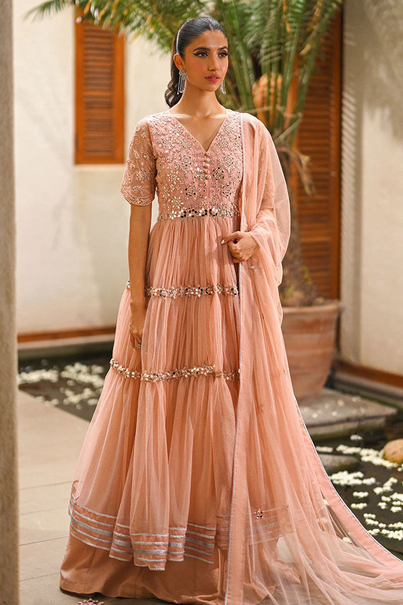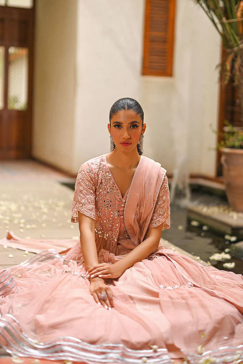 The blush pink net front-open shirt features delicate gathers and mirror detailing, creating an enchanting effect. The self-anchor embroidery and mirror-worked bodice add a touch of intricacy and elegance. The outfit is beautifully finished with silver kingri and Gota accents. Complementing the shirt is a self-jamawar lehnga, enhancing the overall look. The fully mirror-worked net dupatta with tassels adds a graceful flow and movement to the ensemble. This ensemble is a perfect choice for all your festive needs as it combines modern elements with traditional aesthetics, resulting in a charming and memorable look. Shirt: Net Dupatta: Net Pant: Net