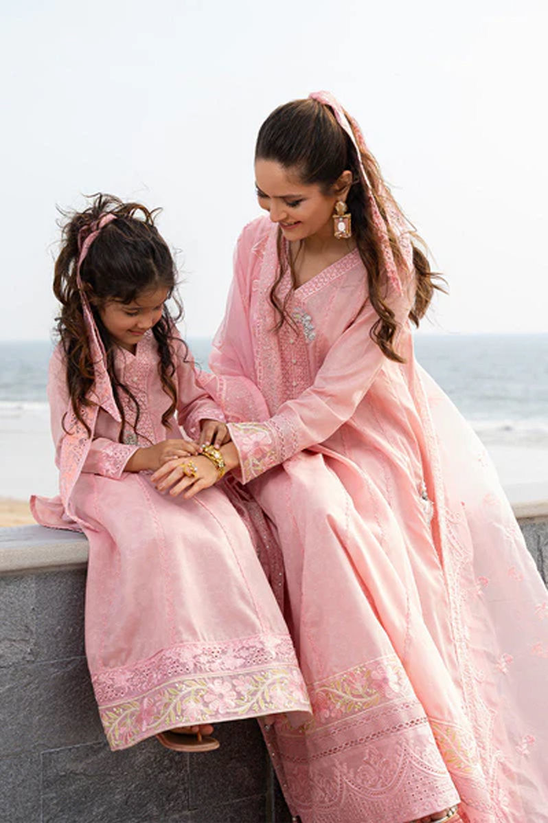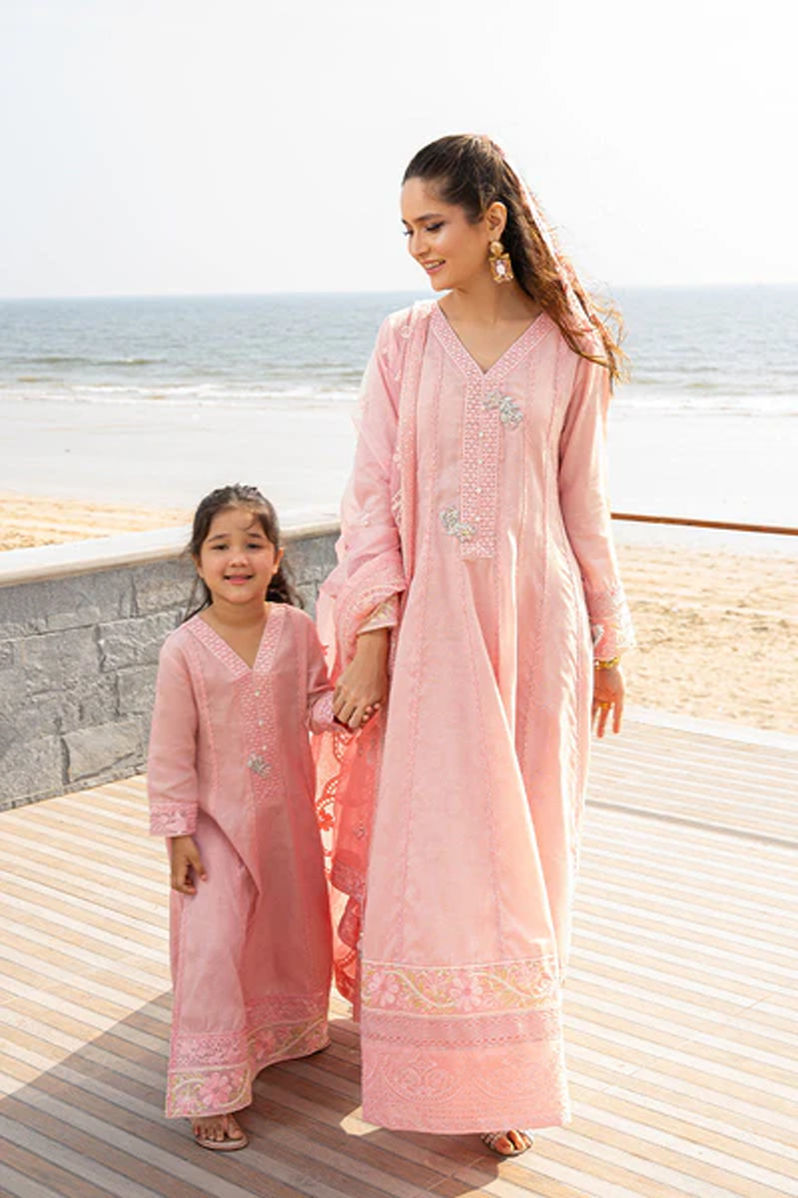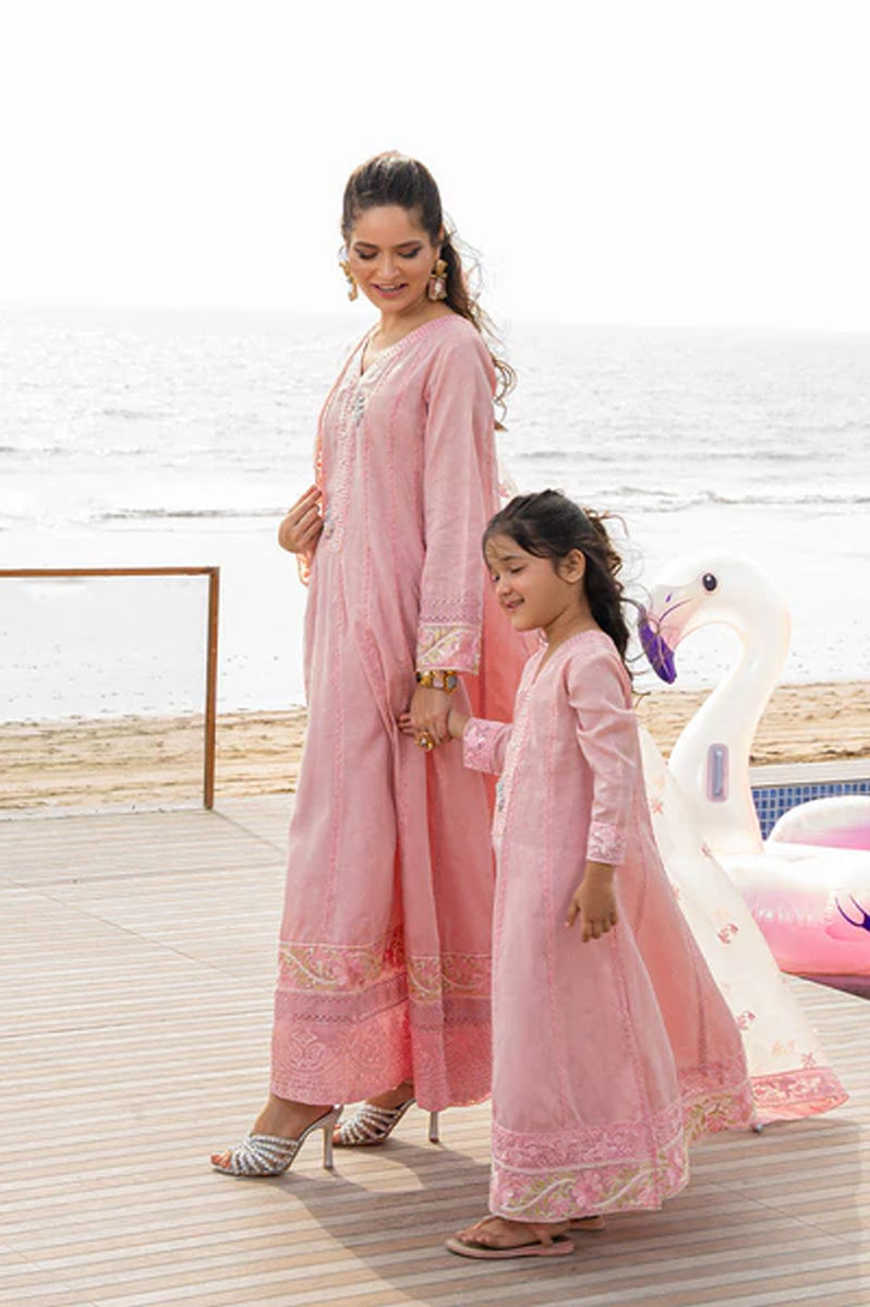 say yes to more pink…. Ubercute pink minime shirt with statement handwork buttons, lace detailings and embrioideries on daaman and sleeves. Cute bows and dainty jewellery is all you need to doll up your little one.Shirt: In-House EmbossedPant: In-House Embossed