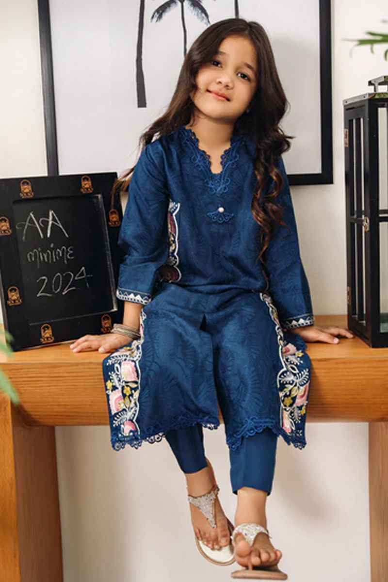 A mini me version of our navy blue shirt is super cute with embroidery and lace detailing with statement pleated neckline and pearl embellishment. Pants are on silkShirt: In-House Embossed SilkPant: In-House Embossed Silk