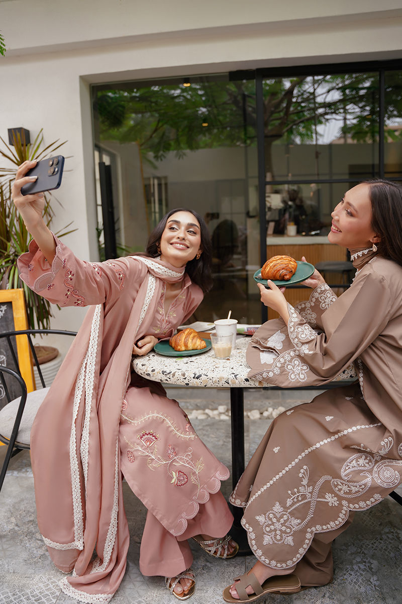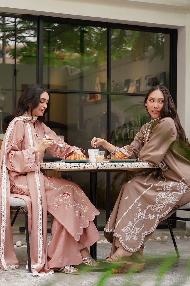 Elevate your wardrobe with this sophisticated latte brown ensemble, featuring a long, scalloped shirt adorned with intricate embroidery inspired by classic dori work in soft off-white thread. Paired with tailored pants for a clean, polished look, the outfit is completed with a flowing silk dupatta ( as an add on) trimmed in fine lace. Ideal for festive gatherings or formal daytime affairs, this ensemble exudes understated elegance with every detail. maximum shirt length:46 Model height:5'5 Style: Loose Fit Shirt: Cambric Lawn Dupatta: Tissue Silk Trouser: Cambric Lawn