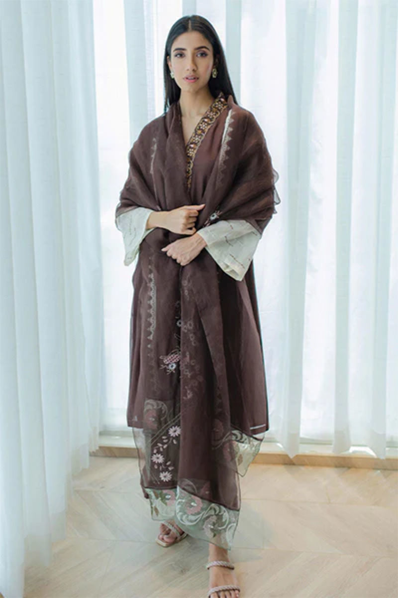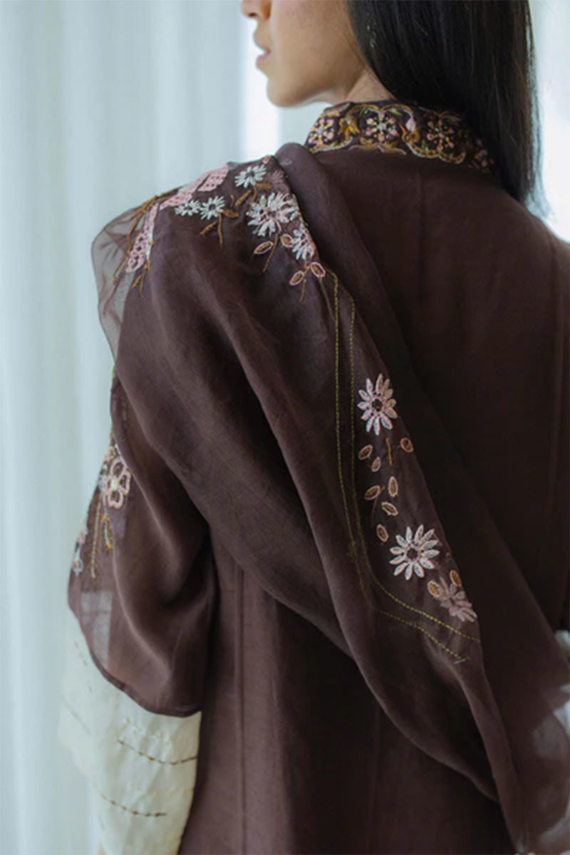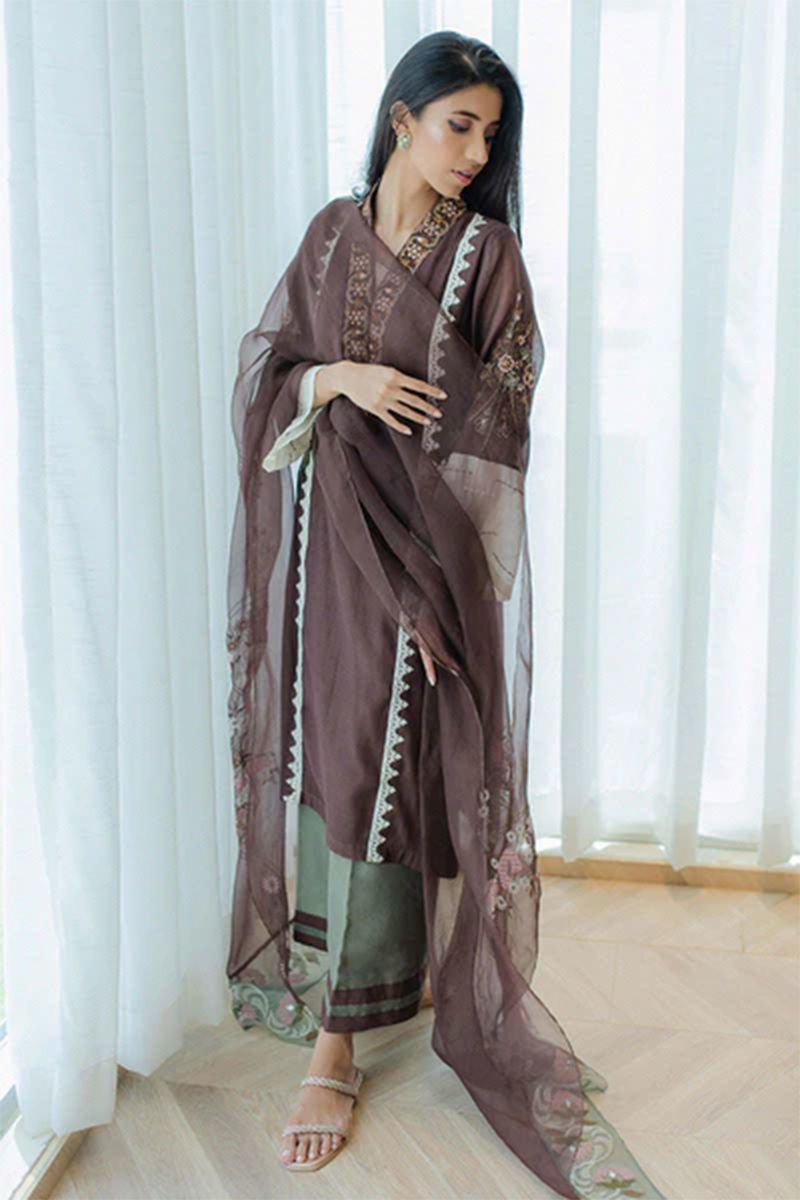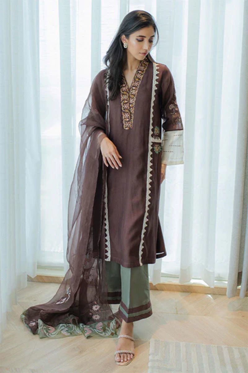 Easy breezy chestnut shirt on summer-friendly kora cotton with in-house appliqued panels. Embroidery in vibrant, earthy, and contrasting tones on the neckline. Embroidered sleeves with Colour block and stitch details add that oomph. Fully embroidered organza dupatta with our in-house geometric border embroidery on pallus and Pants on pure raw silk in pea green tie the whole look together. This outfit comes along with the shirt and dupattaShirt: CottonPant: Cotton