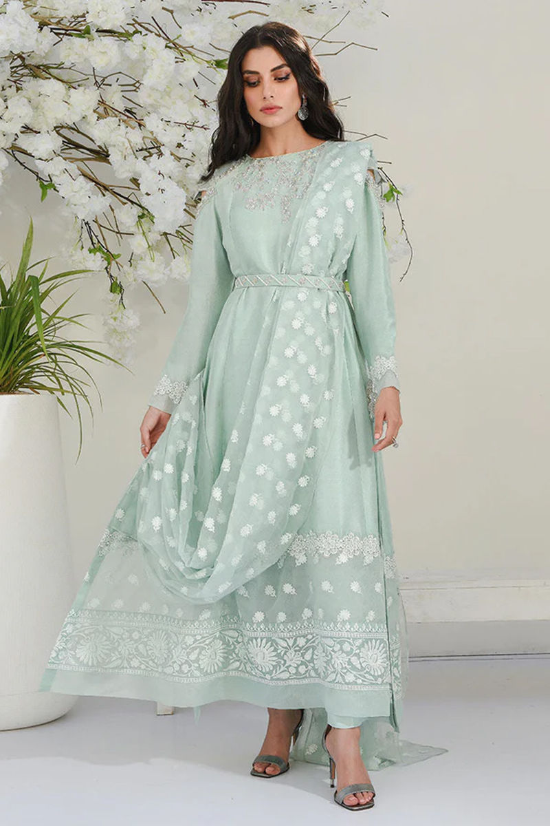 A soft turquoise peshwas perfect for any festive occasion with fully hand worked neckline and chic cutwork. Sleeves with intricate in-house tassels.Dupatta is draped beautifully in a saree to give that perfect oomph!This is definitely a head turner.