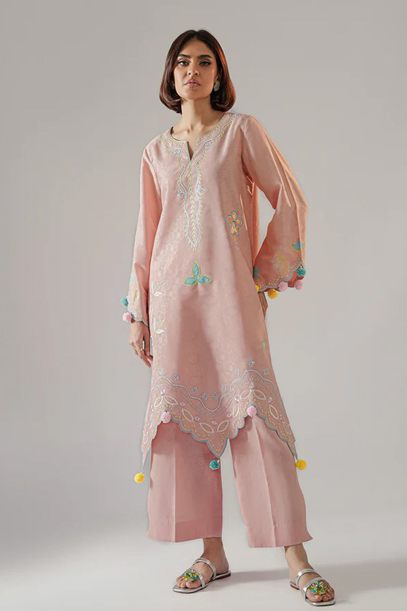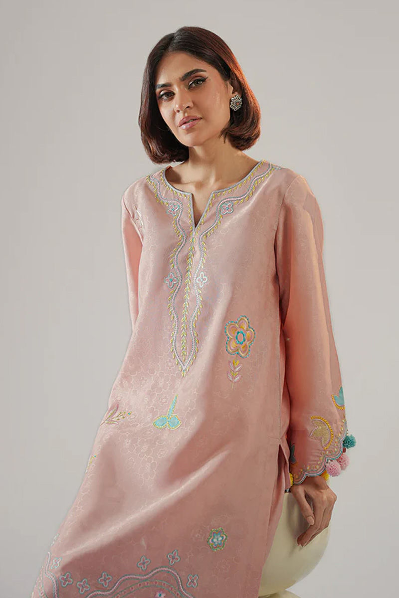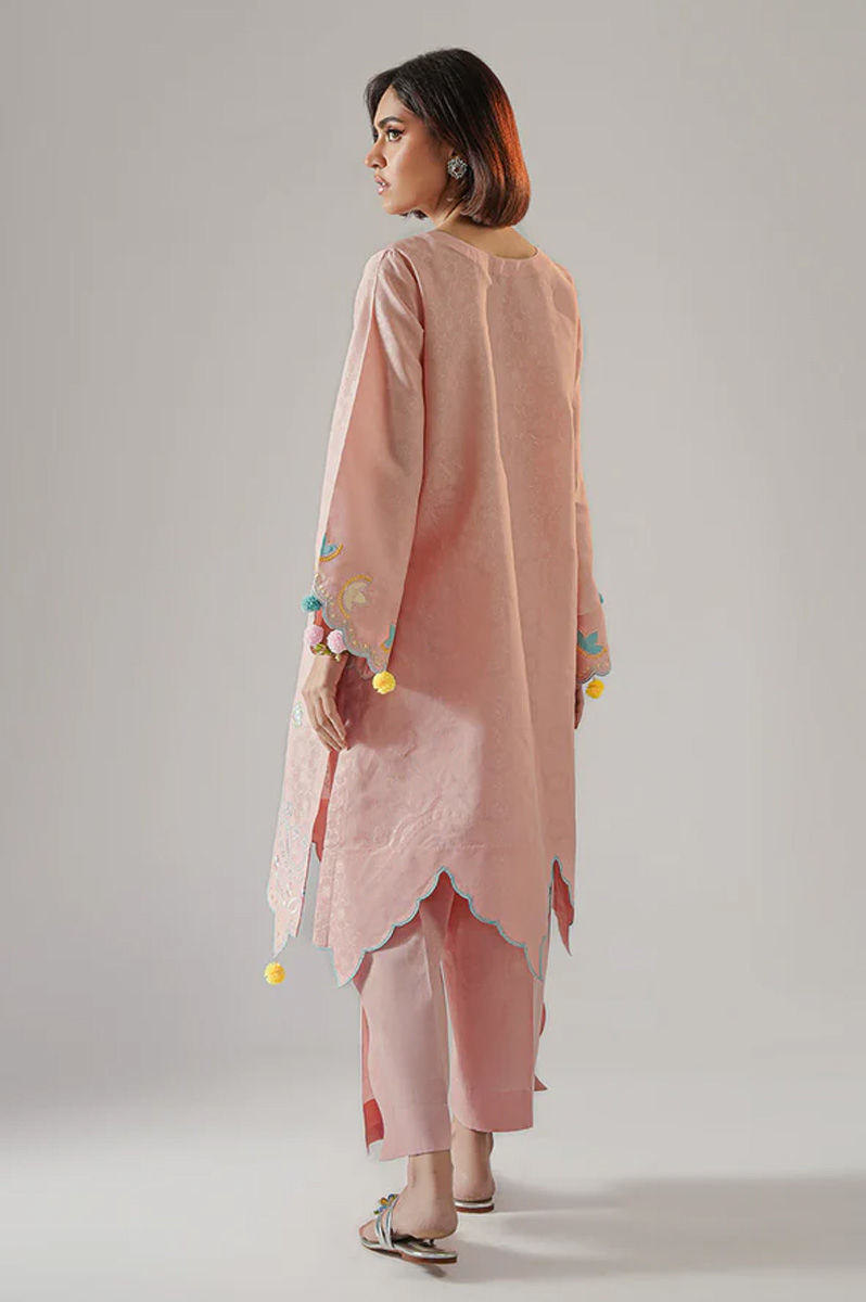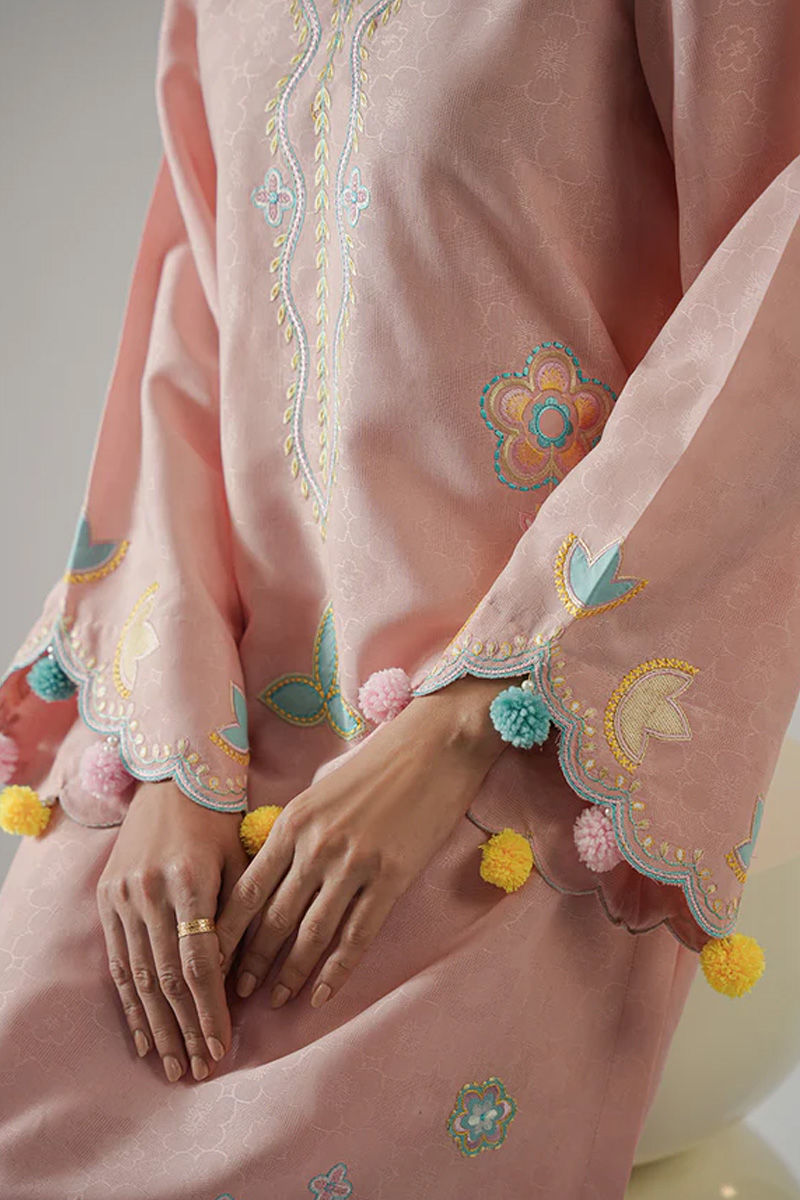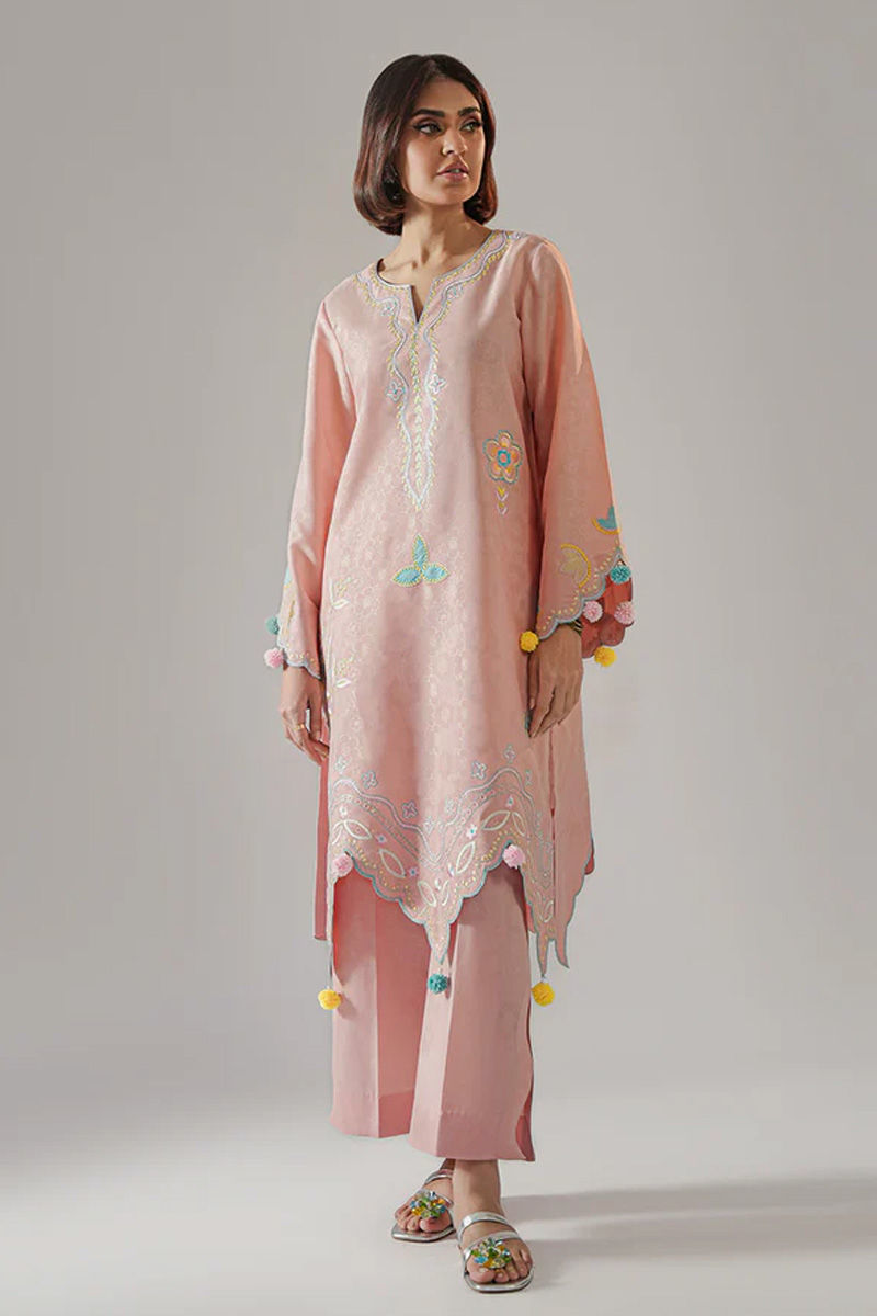 This charming soft pink kurta exudes a graceful, feminine vibe, crafted from our in-house self-printed fabric. The kurta features a beautifully embroidered scalloped hem, adding an element of elegance and sophistication. The pastel-colored embroidery along throughout the design brings a subtle pop of color, with hues of blue, yellow, and blush pink, which perfectly complement the soft pink fabric. Model height 5'9 Shirt maximum length 43