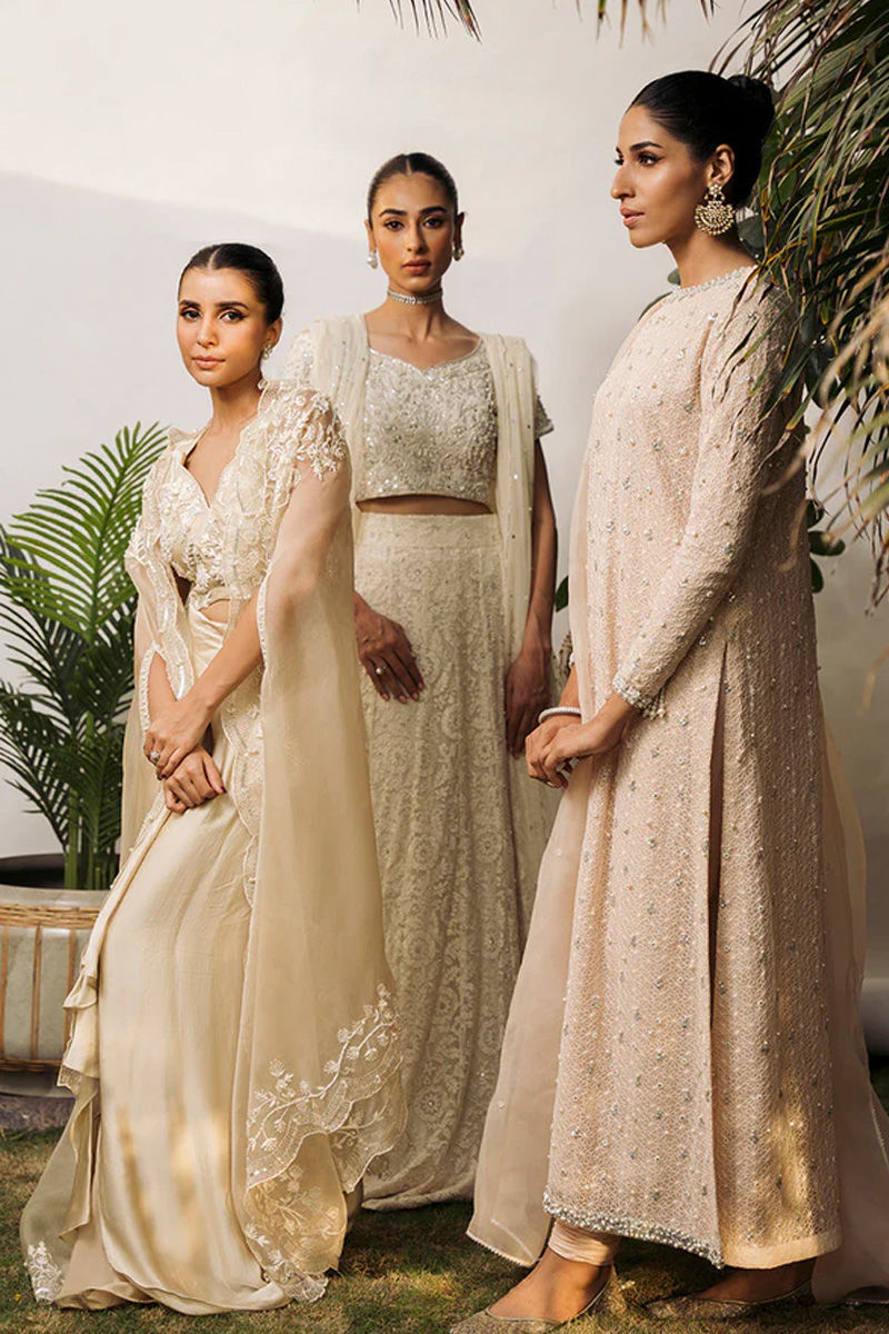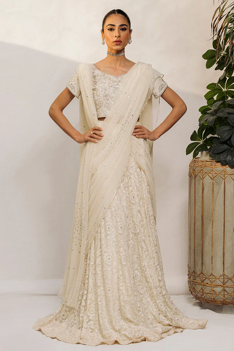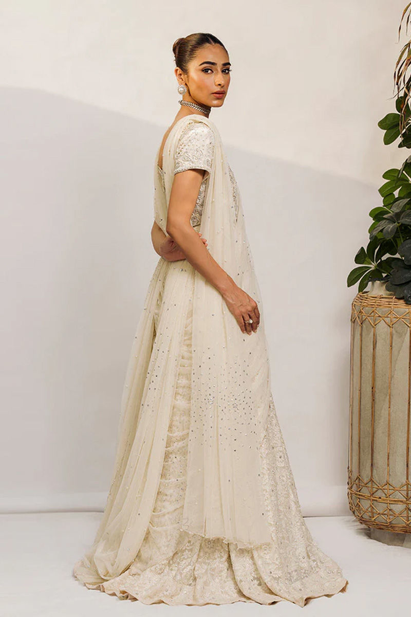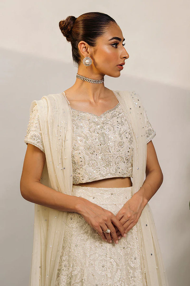 Dreamy ivory lehnga choli on pure raw silk is a must have for engagement/Nikkah brides and bridesmaid. True craftsmanship induced handwork of kora dabka, Gota, pearls, motis and cutwork on pure raw silk choli with modern flair. Lehnga is encrusted with stones on a in-house schiffli embroidered fabric. All about elegance and flair when dupatta is effortlessly draped in multiple ways. Dupatta is on net with intricate pearl and sequence showered all over.Pure Rawsilk Pants comes as Add On.