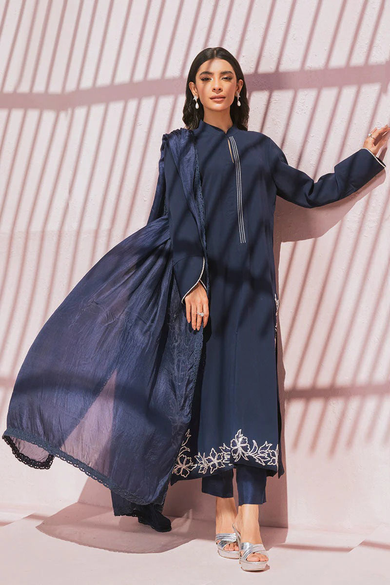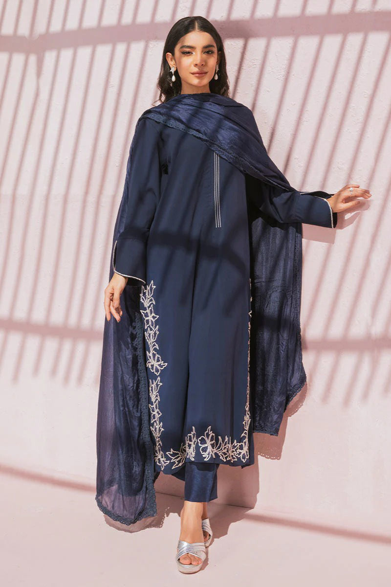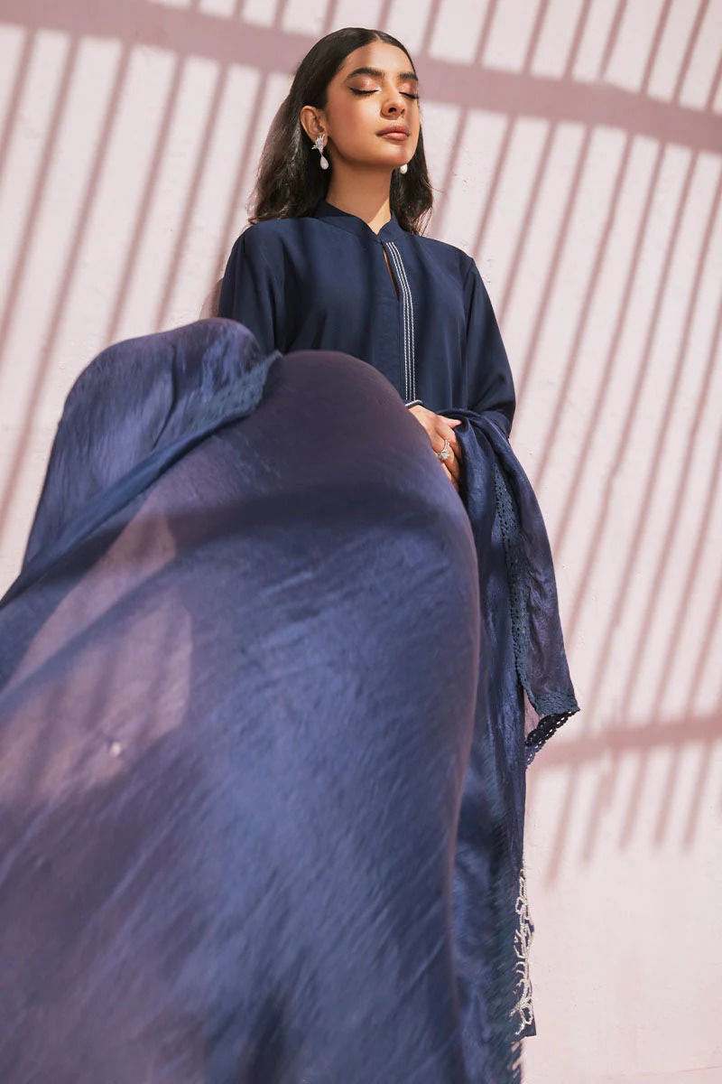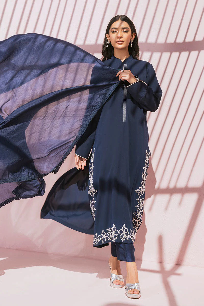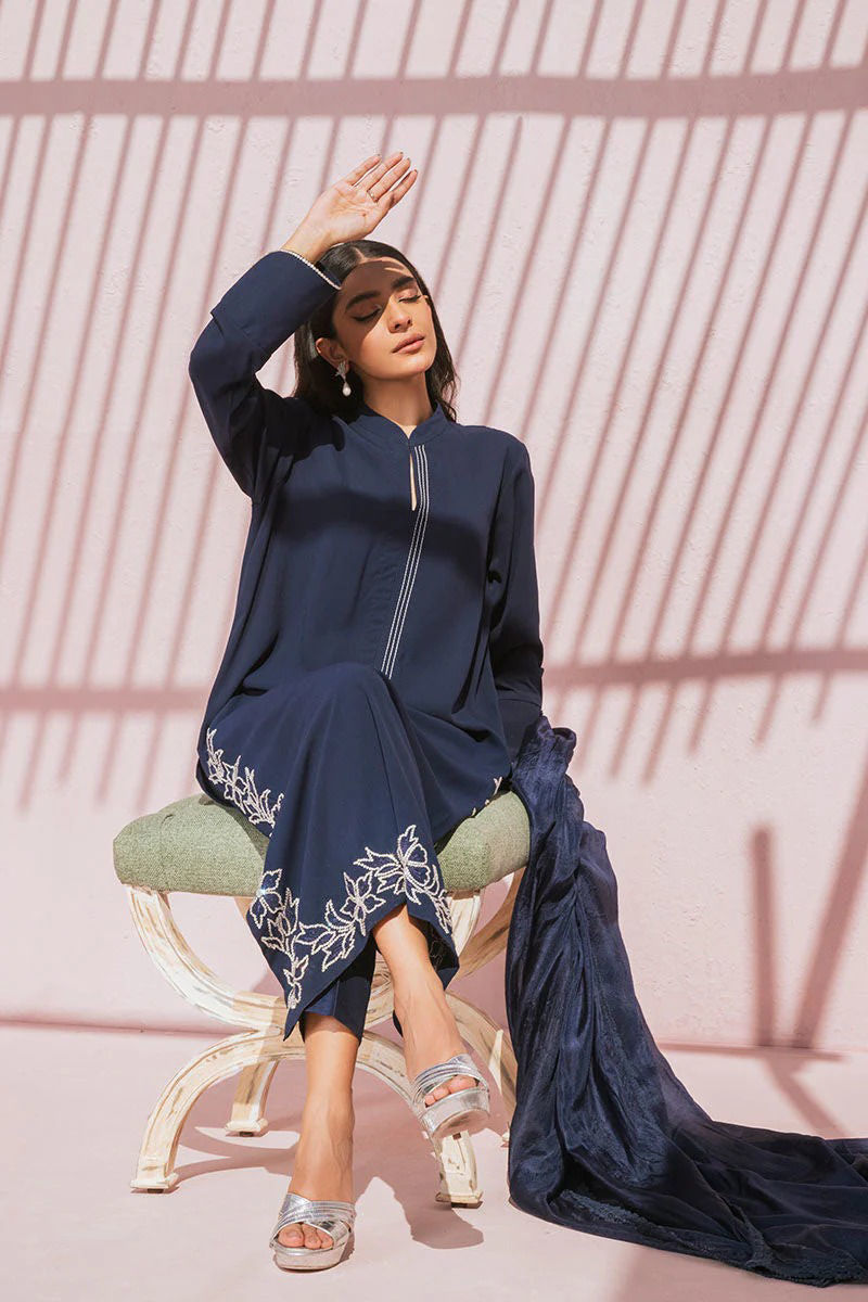 Bling it up this season in a deep tone of navy with fully worked side slits and hemline in Swarovski crystals! The statement sleeves are also lined with Swarovski! A forever-flattering silhouette! Pair it up with your pearls or statement earrings to make heads turn around at any event! It's complemented with silk Duppata with 4 sided lace finish.Shirt: SilkDupatta: Silk