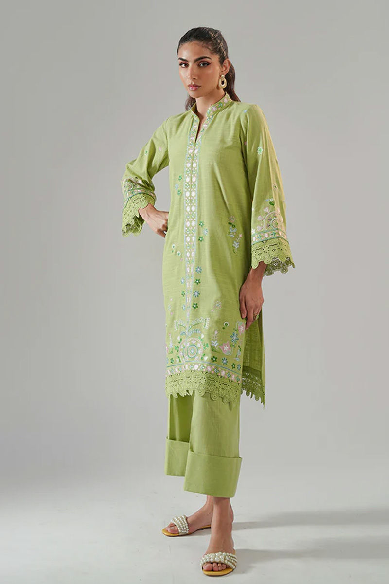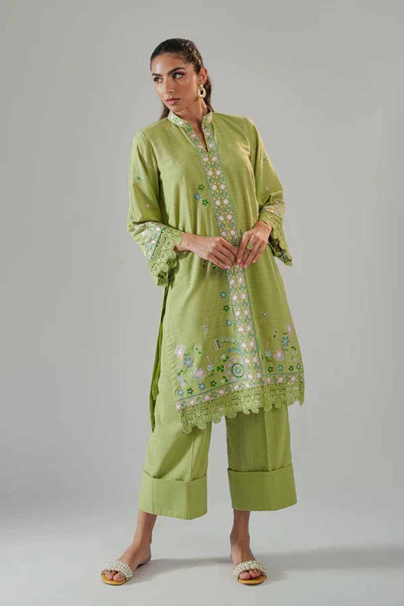 Green is the new black? Surely yes! This striking green embroidered kurta is a perfect blend of vibrant colors and intricate craftsmanship. The rich green fabric serves as a beautiful canvas for detailed embroidery in shades of pink, blue, and dark green, creating a lively, eye-catching design. The kurta is finished with delicate cutwork along the edges, adding a refined, feminine touch to the overall design. Paired with the kurta is a set of tailored trousers, featuring a cuffed bottom that adds a modern, clean finish to the outfit. Model height 5'10 Shirt length 30.