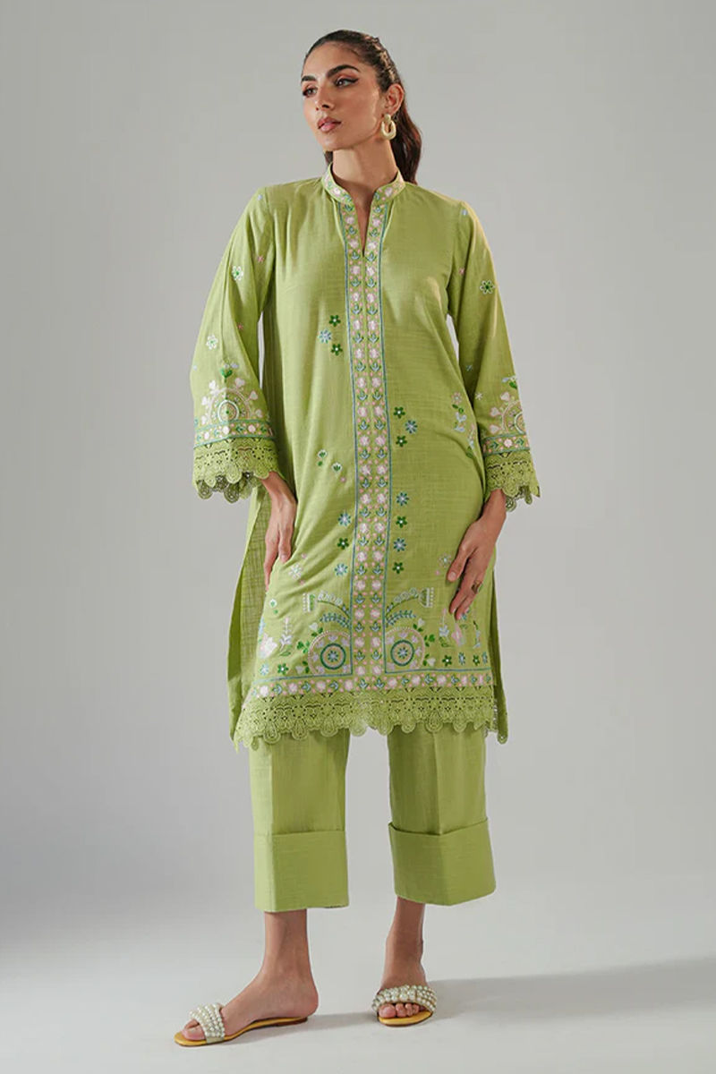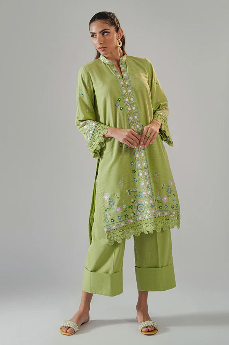 Green is the new black? Surely yes! This striking green embroidered kurta is a perfect blend of vibrant colors and intricate craftsmanship. The rich green fabric serves as a beautiful canvas for detailed embroidery in shades of pink, blue, and dark green, creating a lively, eye-catching design. The kurta is finished with delicate cutwork along the edges, adding a refined, feminine touch to the overall design. Paired with the kurta is a set of tailored trousers, featuring a cuffed bottom that adds a modern, clean finish to the outfit. Model height 5'10. Shirt length 30.