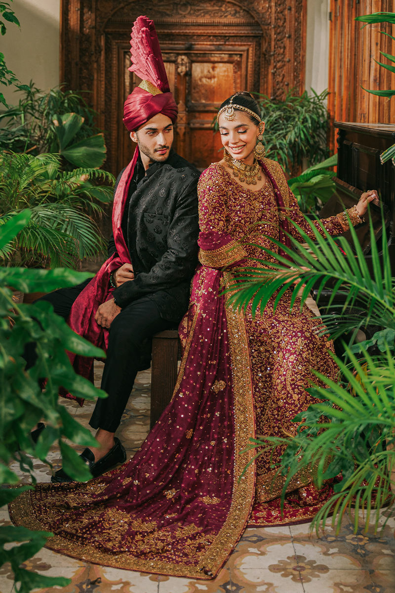 Embrace elegance and timeless beauty with this exquisite bridal ensemble in deep burgundy maroon. Crafted from pure silk net, the straight-cut shirt boasts a graceful silhouette, adorned with intricate hand embroidery that showcases countless hours of expert craftsmanship. The tailored farshi lehenga with a hot red frilled edge, made from luxurious pure jamawar, flows with a regal charm, perfectly complementing the shirt’s delicate embroidery. Completing the look is a classic draped dupatta, also heavily embroidered, adding a sophisticated touch to this opulent outfit. The ensemble's rich, deep hues are enhanced by the fine detailing of the embroidery, which features a blend of traditional motifs and contemporary designs. Each stitch reflects the dedication and artistry of the artisans, making this outfit not just a piece of clothing, but a work of art. Hand-crafted Tassels are given at the back to lift the overall outfit. Pair the outfit with a regal hand-worked pouch giving the oomph to the regal look. Styling tip: A statement necklace with intricate designs, matching chandelier earrings, and a delicate maang tikka can enhance the regal appeal!