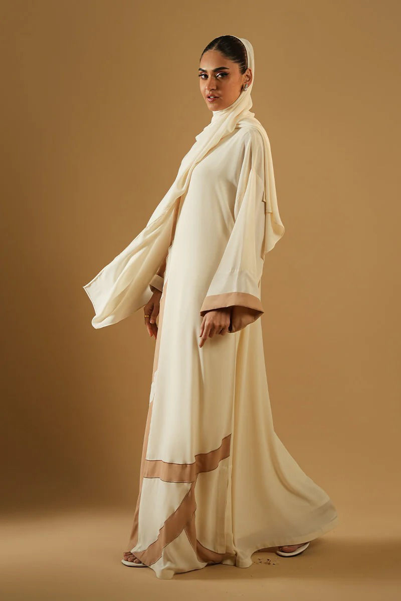 Embrace modern sophistication with this ivory beige abaya, designed with a contemporary abaya cut that offers a sleek and flattering silhouette. The subtle elegance of the ivory beige fabric is beautifully contrasted by the bold color-blocking straps, adding a chic and unique twist to a timeless piece. The color-blocking design creates a striking visual effect, making this abaya perfect for those who want to merge classic style with a touch of fashion-forward flair. Versatile and stylish, this abaya is ideal for both day and evening wear, offering a blend of comfort and high-fashion appeal. Model height 5'8. maximum length 60"