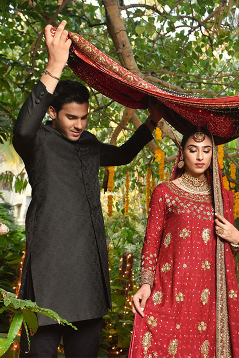 A classic black sherwani with a classic black bridal is what every man dreams of! Twirl your beautiful bride and create magical moments. Sherwani is cut from soft jamawar.