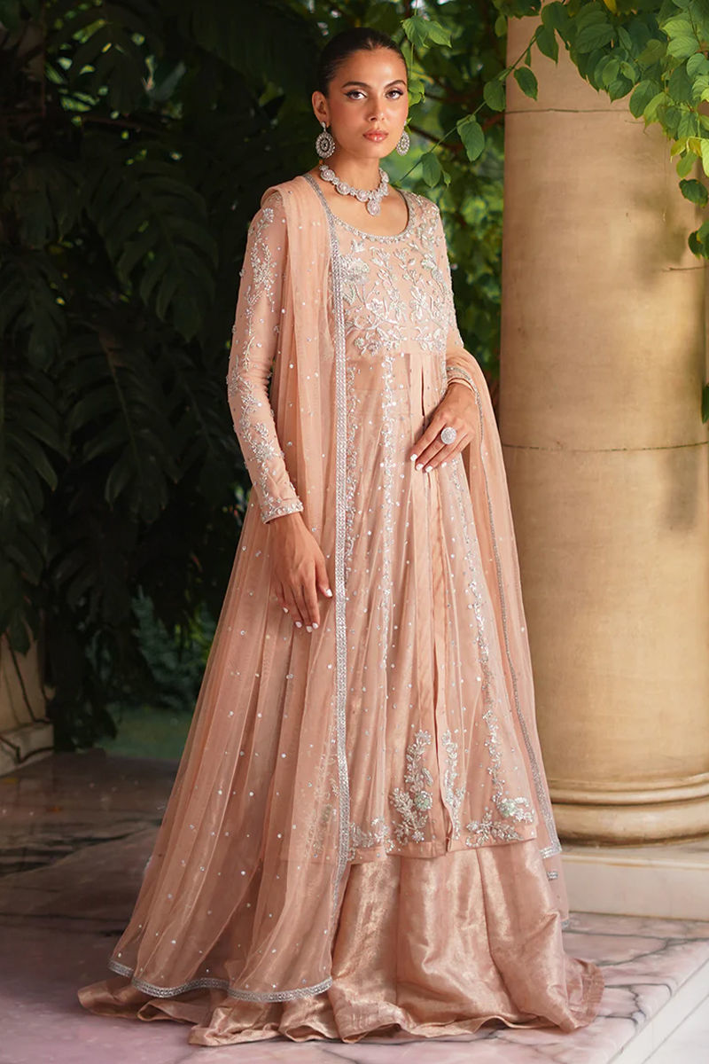 Delicate and graceful, this pink net paneled shirt with a front opening is adorned with intricate silver dabka, sitara, stones, and resham embroidery, creating a refined sparkle against the soft hue. It is paired with a net dupatta sprinkled with delicate chan, adding an airy elegance to the look. Completing the ensemble, a voluminous self-silk lehenga lends depth and regal charm, making this outfit a perfect balance of softness and grandeur. Lehenga: Self Silk Shirt: Net Dupatta: Net