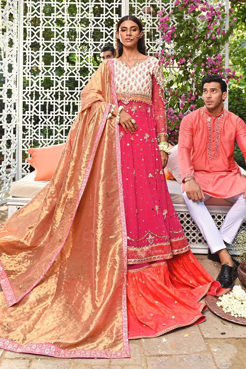 Season’s hottest pink is a must for your festive needs! It’s a perfect fit for an intimate Dulhan or her Saheli. Fully worked handprinted bodice in kora dabka Japanese beads, the sleeves are intricately worked with appliqués, handmade jaili and hand work making it a complete festive package! The kalidar is sprayed all over with chan and booties and a scalloped handworked border! The back is intricately worked also with beautiful dazzling tassels! We have paired it up with a farshi lengha with beautiful self banarasi and gotta chan! The Duppata is a contrasting tone of rust tissue fully laden with mukesh and finished with four-sided border - To make it more festive add another Chunri duppata fully sprayed with mukesh and 4-sided intricately fully hand worked zardozi borders . Lehenga: Net Shirt: Net Dupatta: Net