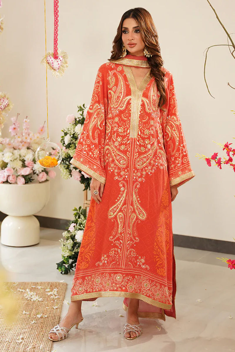 A bold statement in tomato red, this pure crepe ensemble features an artistic fusion of traditional paisleys with a modern layout, creating a vibrant and contemporary look. The design is tastefully enhanced with gold dori and gota embellishments, adding a touch of festive sparkle and refined detailing. It is paired with a tissue silk dupatta, finished with delicate gota accents that complement the shirt's embellishments beautifully.Shirt maximum length: 50Model height 5’8