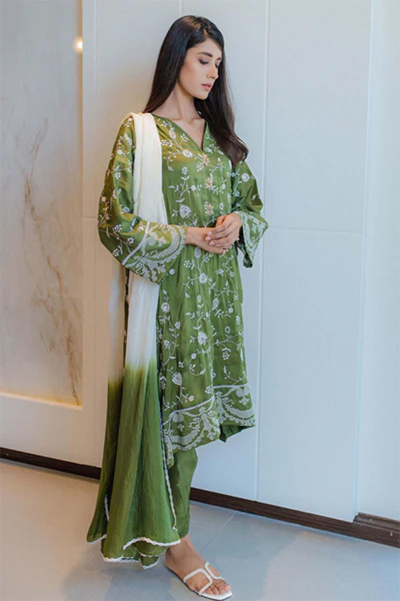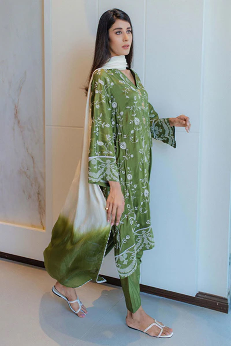 A traditional play on jaal work on this zaituni olive pure raw silk shirt with in-house geometric embroidery on daaman and sleeves. Pleated shalwar adds volume and a modern edge to the traditional look. Ombre dupatta on tissue silk competed with laces is a statement in itself. This outfit comes along with the shirt and shalwarShirt: Raw SilkDupatta: Raw Silk
