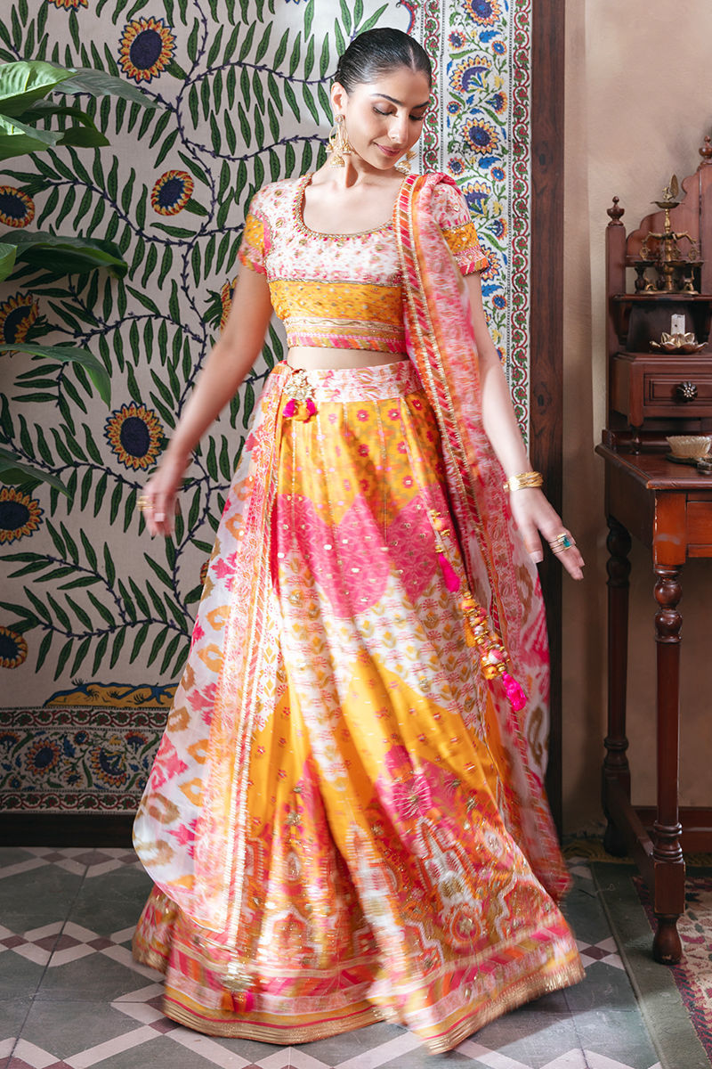 Make a statement in this stunning ivory ensemble, where traditional artistry meets contemporary style. Featuring an exquisite ikat print with accents of pink and yellow, this outfit is adorned with intricate handwork of sequins, stones, kora, dabka, resham, and moti, creating a dazzling effect that graces the Choli, and lehnga. The outfit is paired with a flowing lehenga that adds volume and grace, while the printed organza dupatta, with its dazzling tassels, completes the look with an ethereal charm. Style it with statement jewelry and heels for a look that captures attention and exudes timeless elegance. Lehenga: Raw Silk Choli: Raw Silk Dupatta: Organza