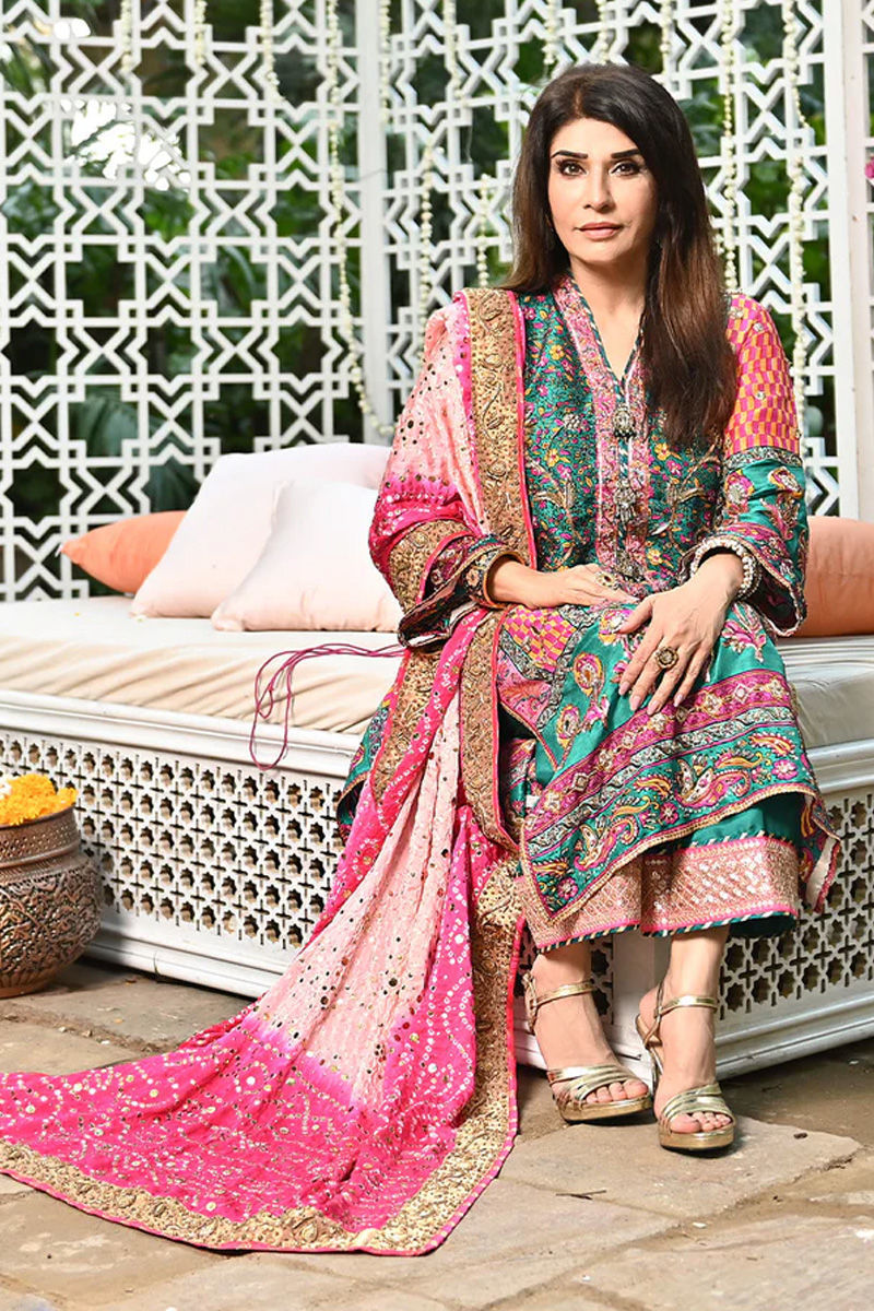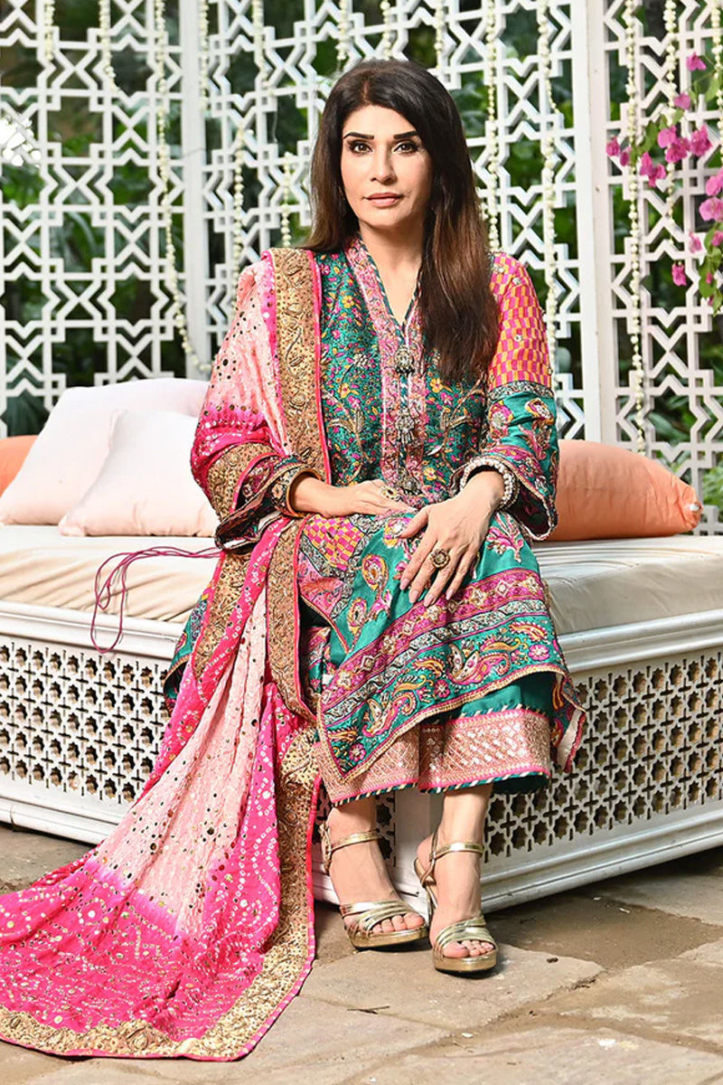 An Array of colours on a beautiful Emerald Toned Silk Shirt making it an instant favourite baraat and mehdni outfit! It is generously enriched with zardozi, kora dabka gotaa and French knots with beautiful floral motifs and jaal. The neckline and silhouette of the Kurta and ijzar makes it a beautiful fit for any body type! It is complemented with a same toned ijzar with a hot pink worked border to make it an absolute must have! We have paired it up with a hot pink disc chan and got finished net duppata! Amna Totally suggests to add the pure silk Chunri with full splash of Kamdani and four sided fully hand worked border! Shirt: Silk Dupatta: Silk Pant: Silk